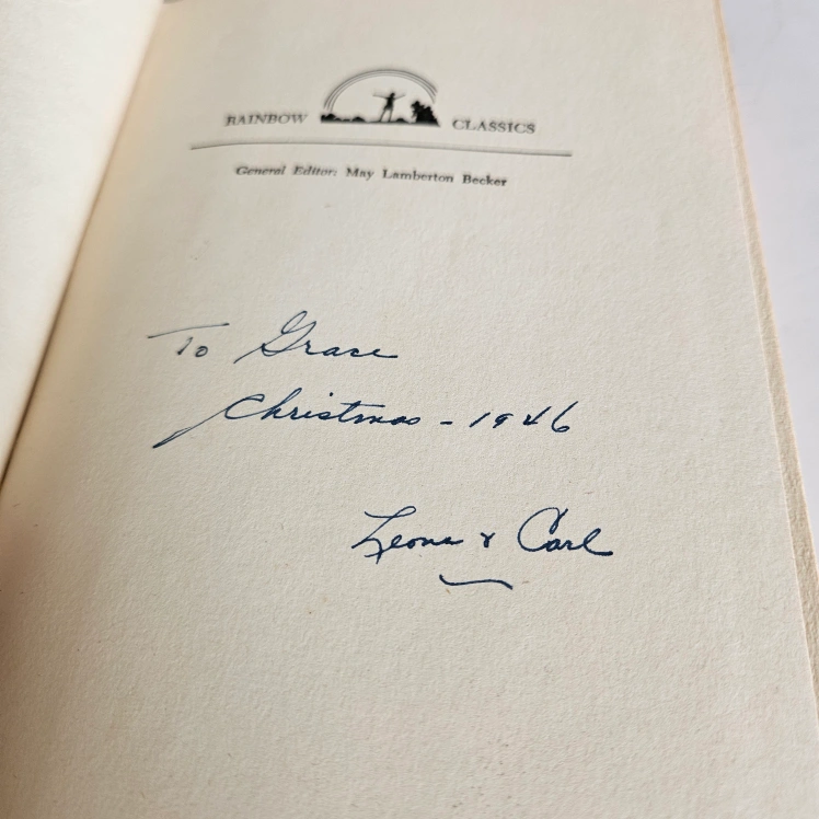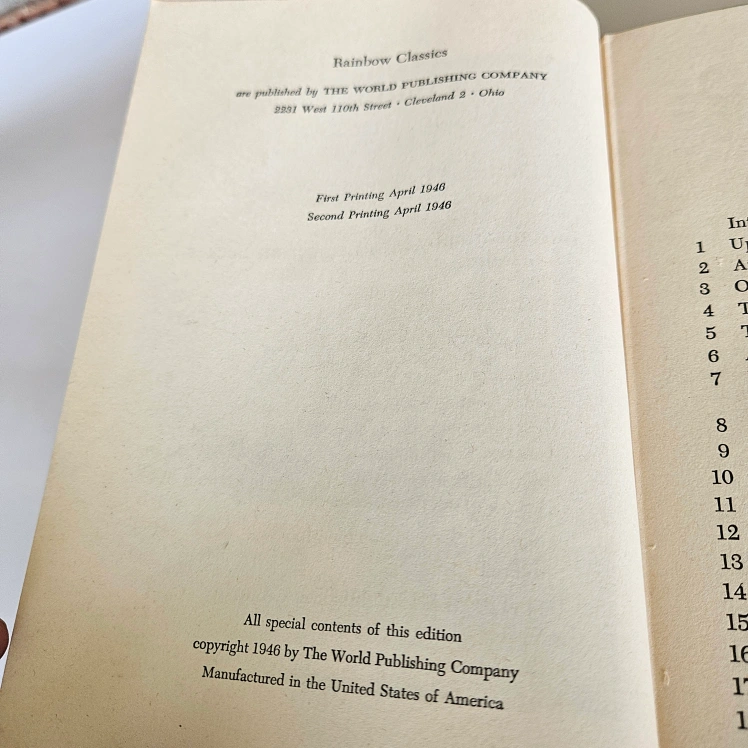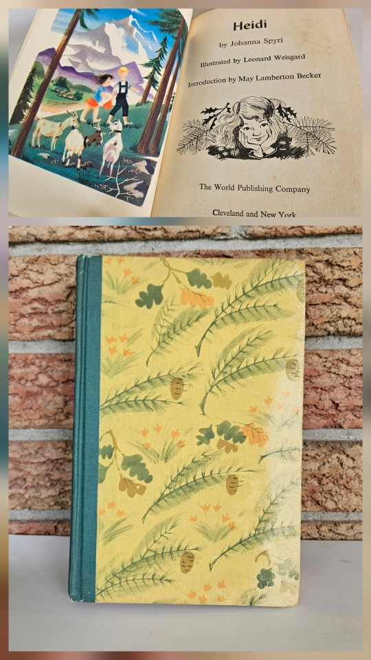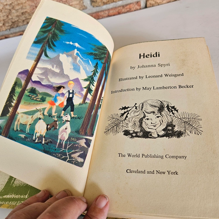 The outside hard cover has wear on corners/edges. There is sun/fading damage on both front and back. Please see photos provided as they are part of the description. Inside pages are not affected and in very good used condition. Delve into the timeless story of "Heidi" with this Vintage 1946 Rainbow Classics edition by Johanna Spyri, brought to life through beautifully illustrated hardcover pages. Published by The World Publishing Company, this collectible piece hails from Cleveland and offers a classic journey through the Swiss Alps with its captivating narrative and charming illustrations.