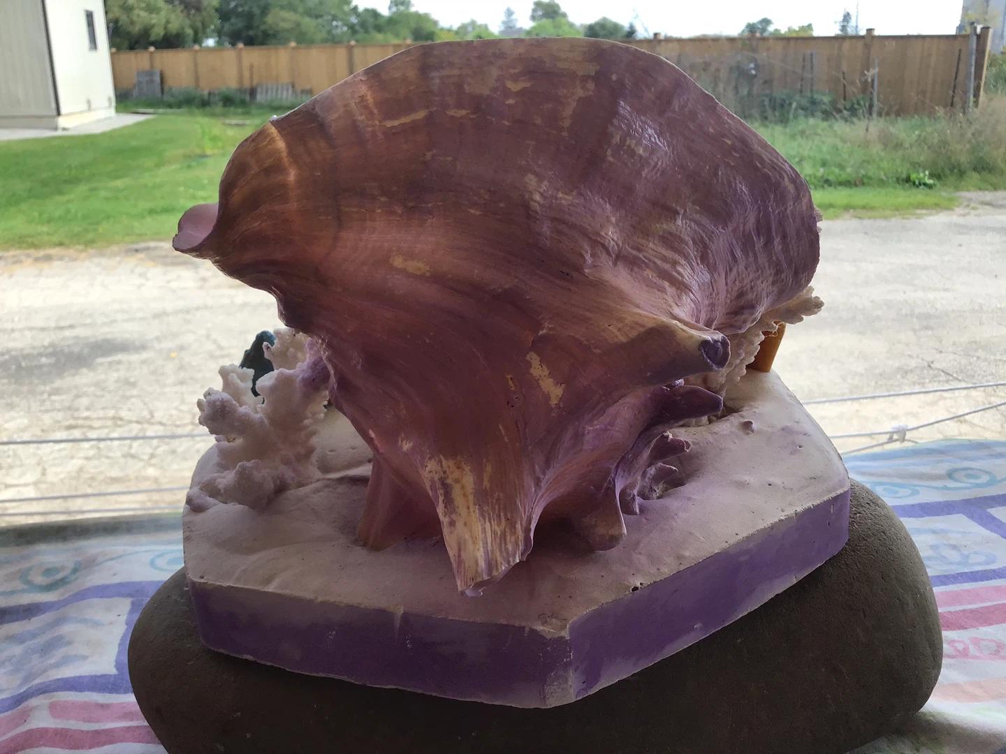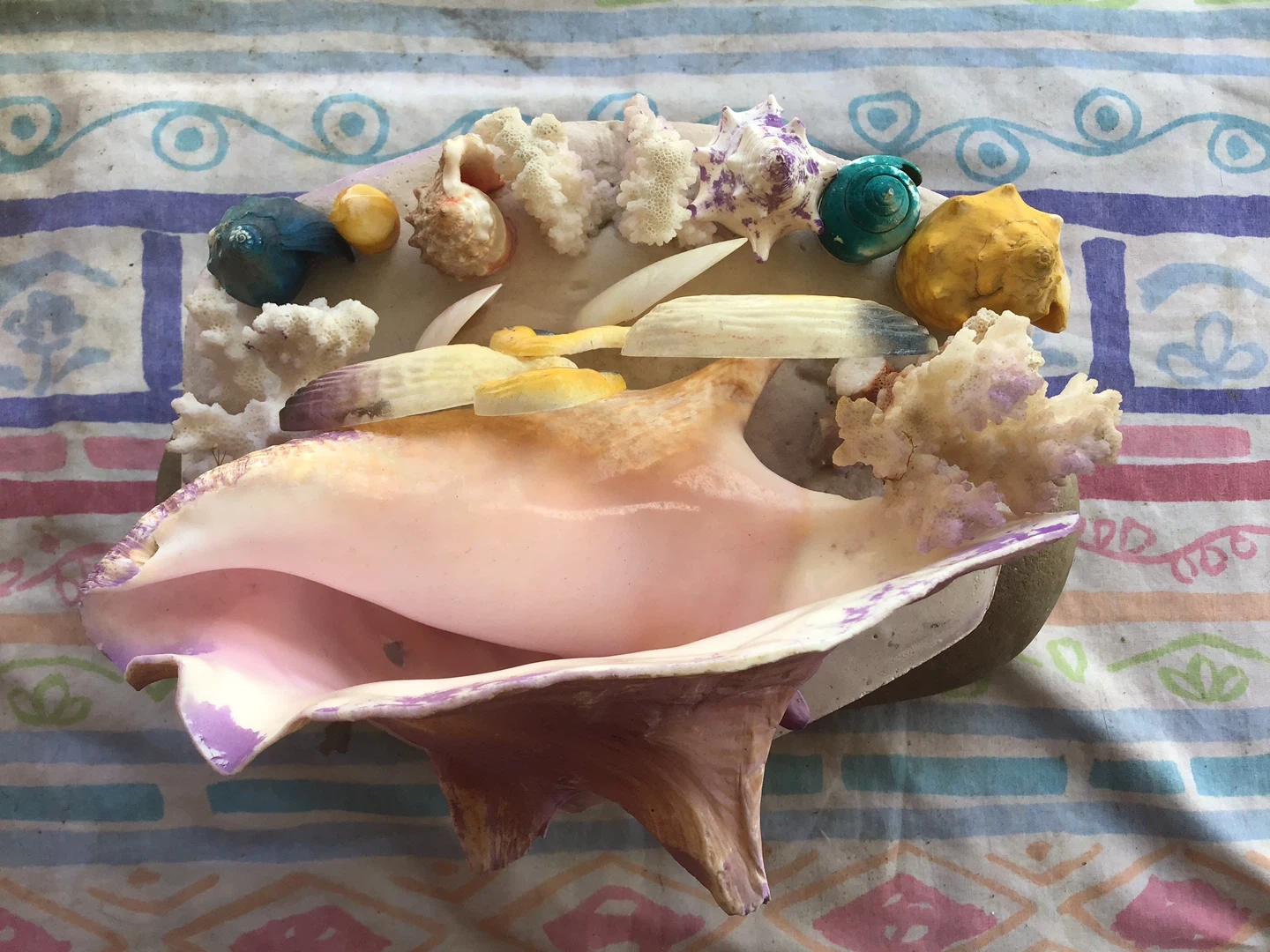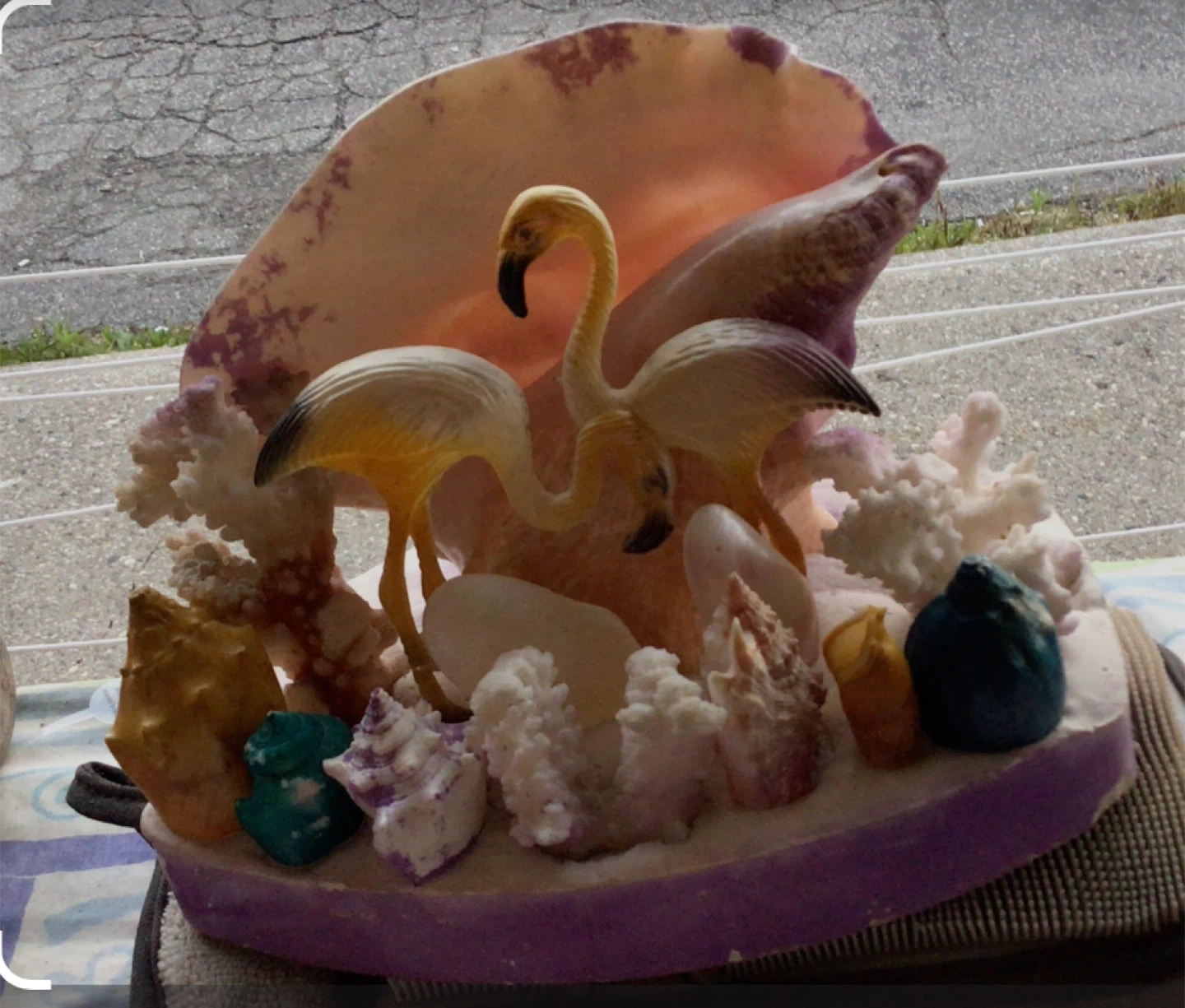 Used/Faircondition Purchased in Florida in the 1960’s A thick plaster base 2 plastic Flamingos in front of Lg Congo Shell Coral and sea shells in front Colourful