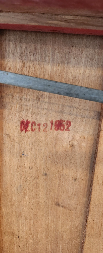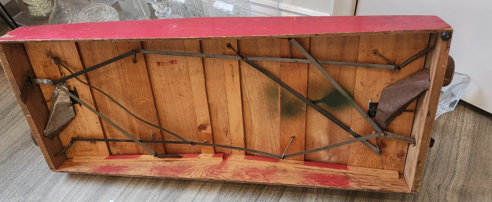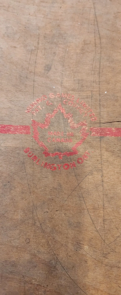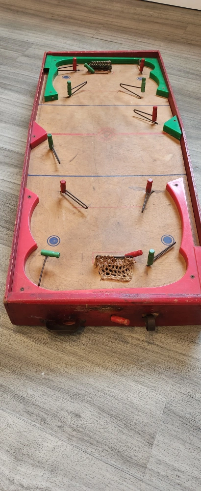 Vintage table hockey game. Made in Canada. Has two players, a puck, and a net.