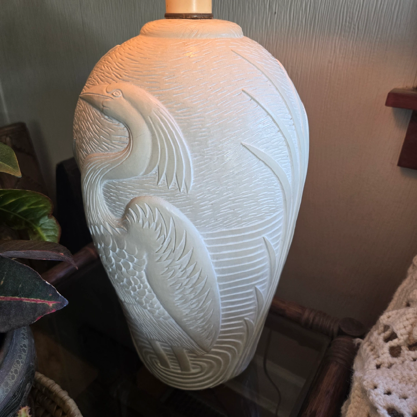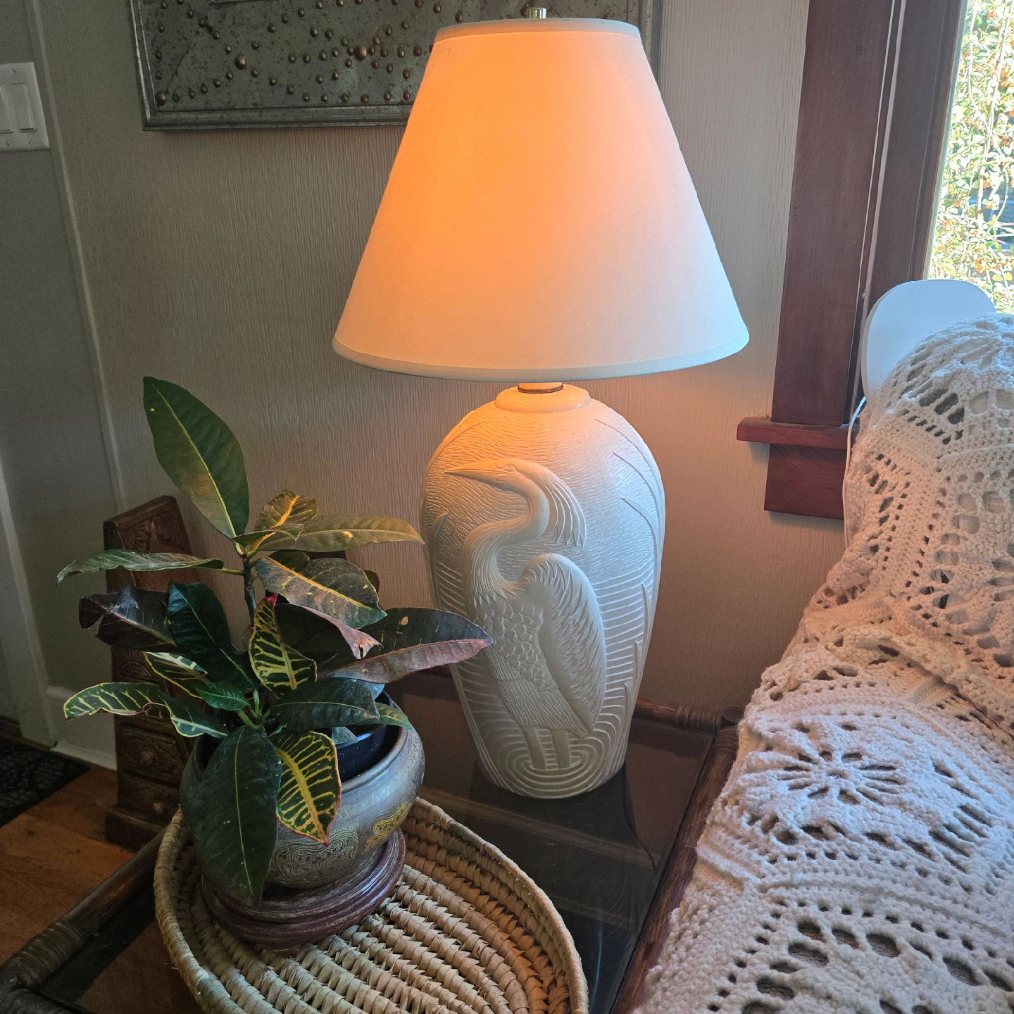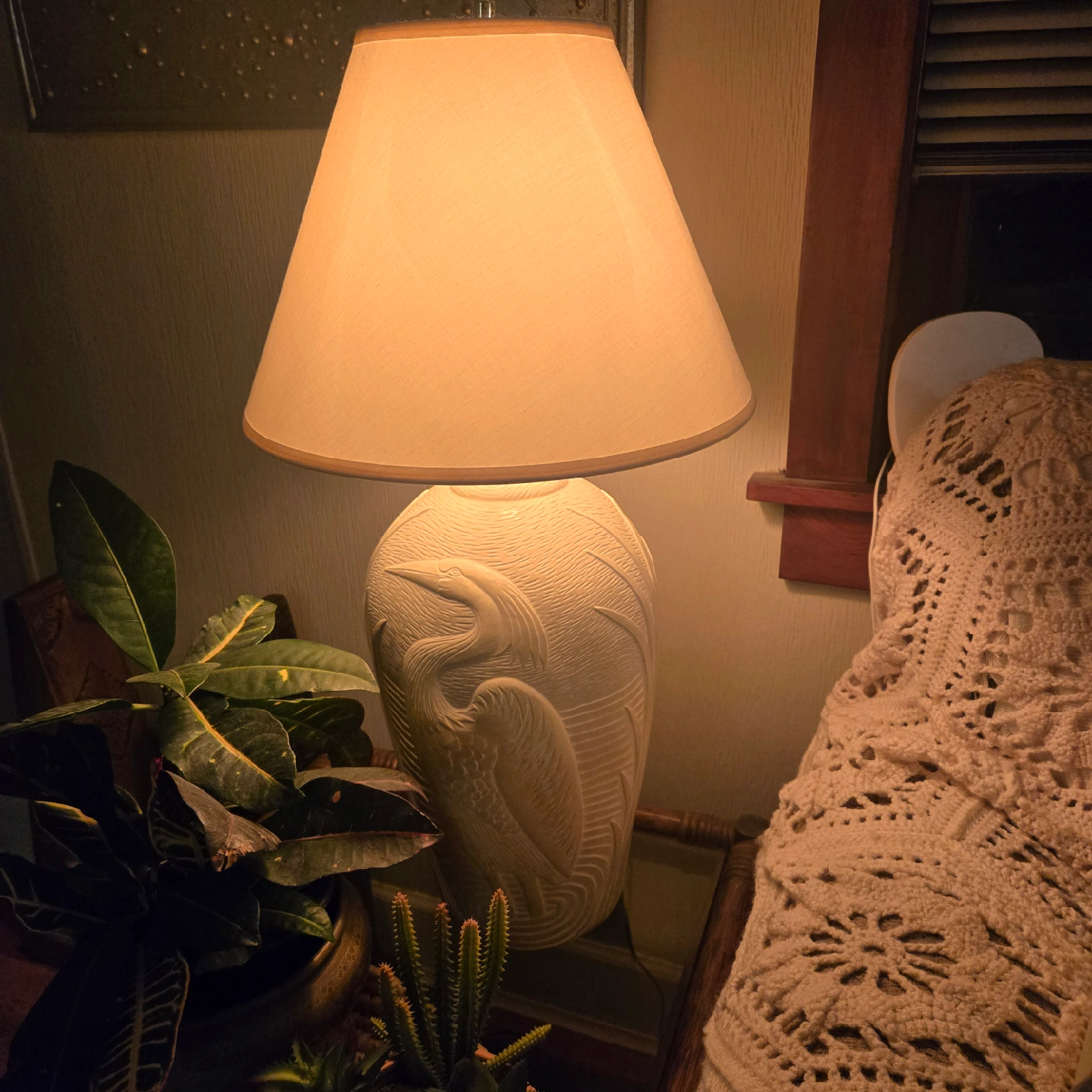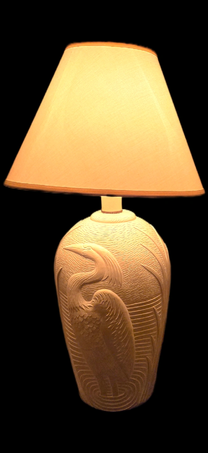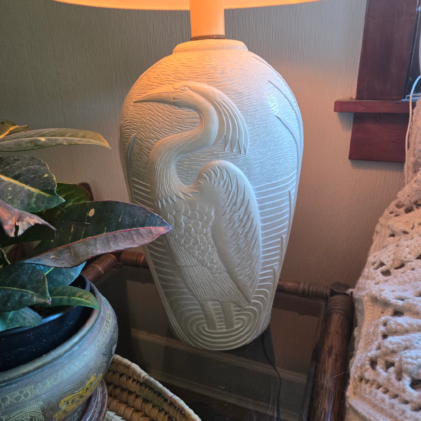 This collectible retro 1970s 80s lamp features a calming cream colour ceramic heron design. • Heron Pottery Tall Table Lamp". • lamp height 27" • lamp diameter 9" at widest • lamp diameter 6" at base • shade height 12.5" • shade diameter 20"