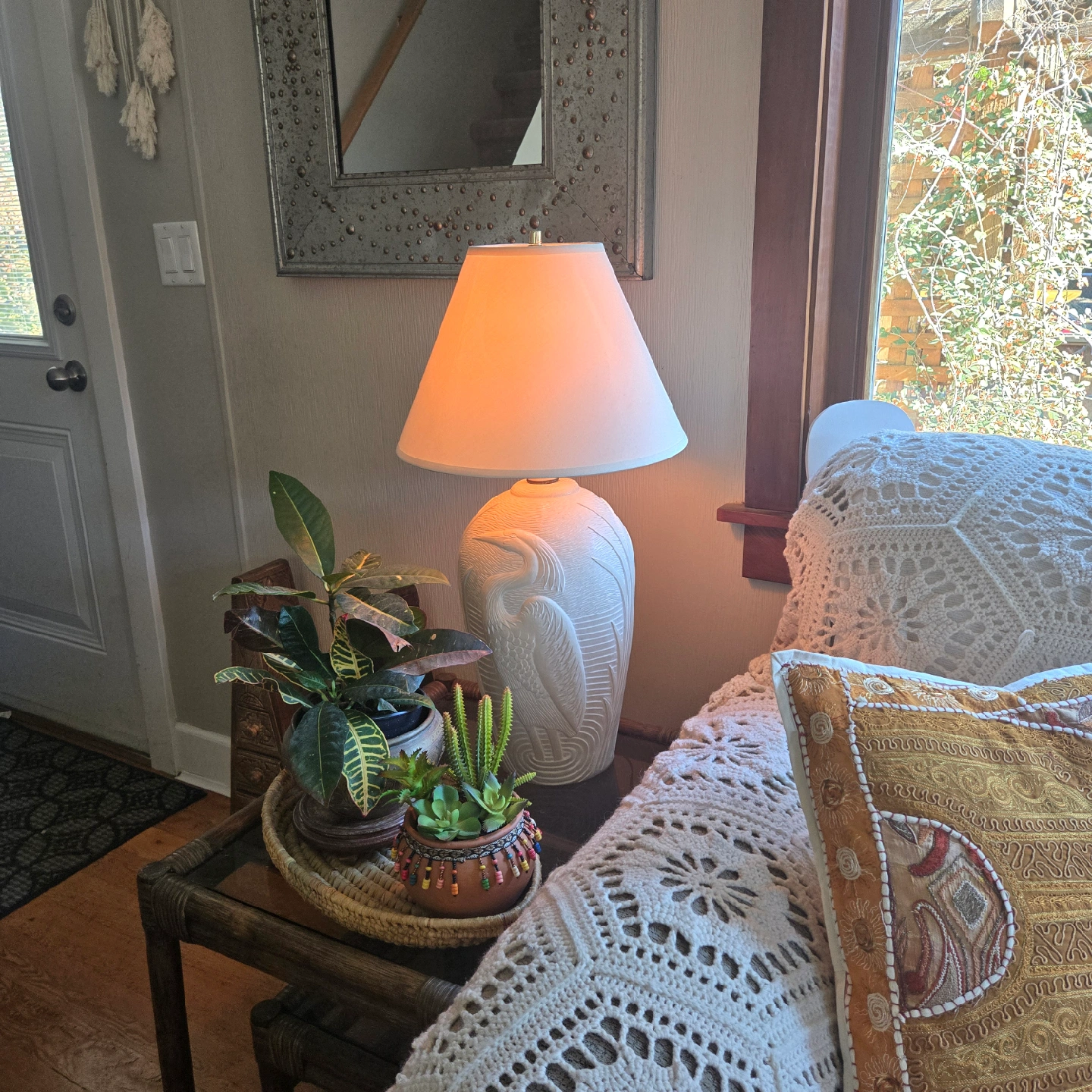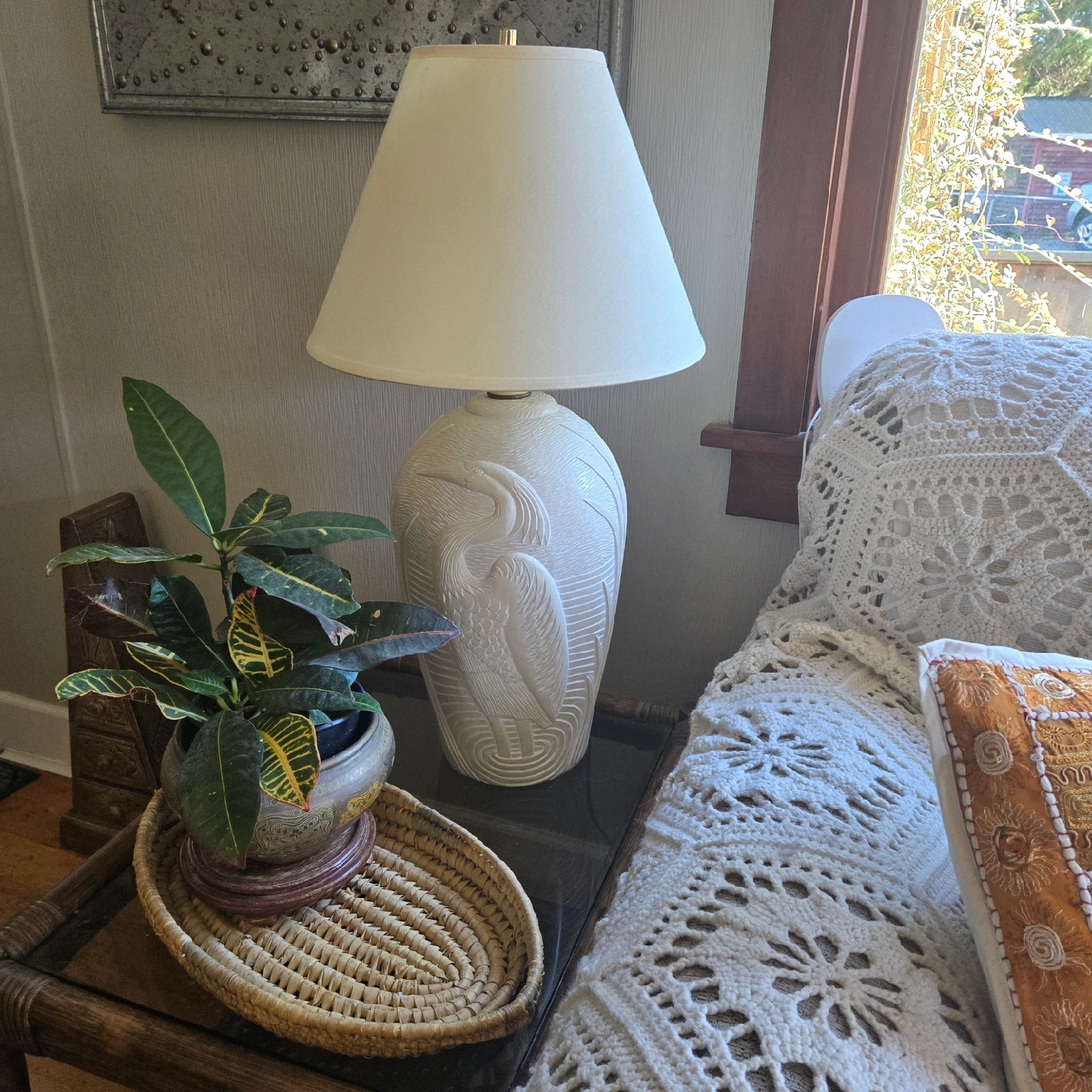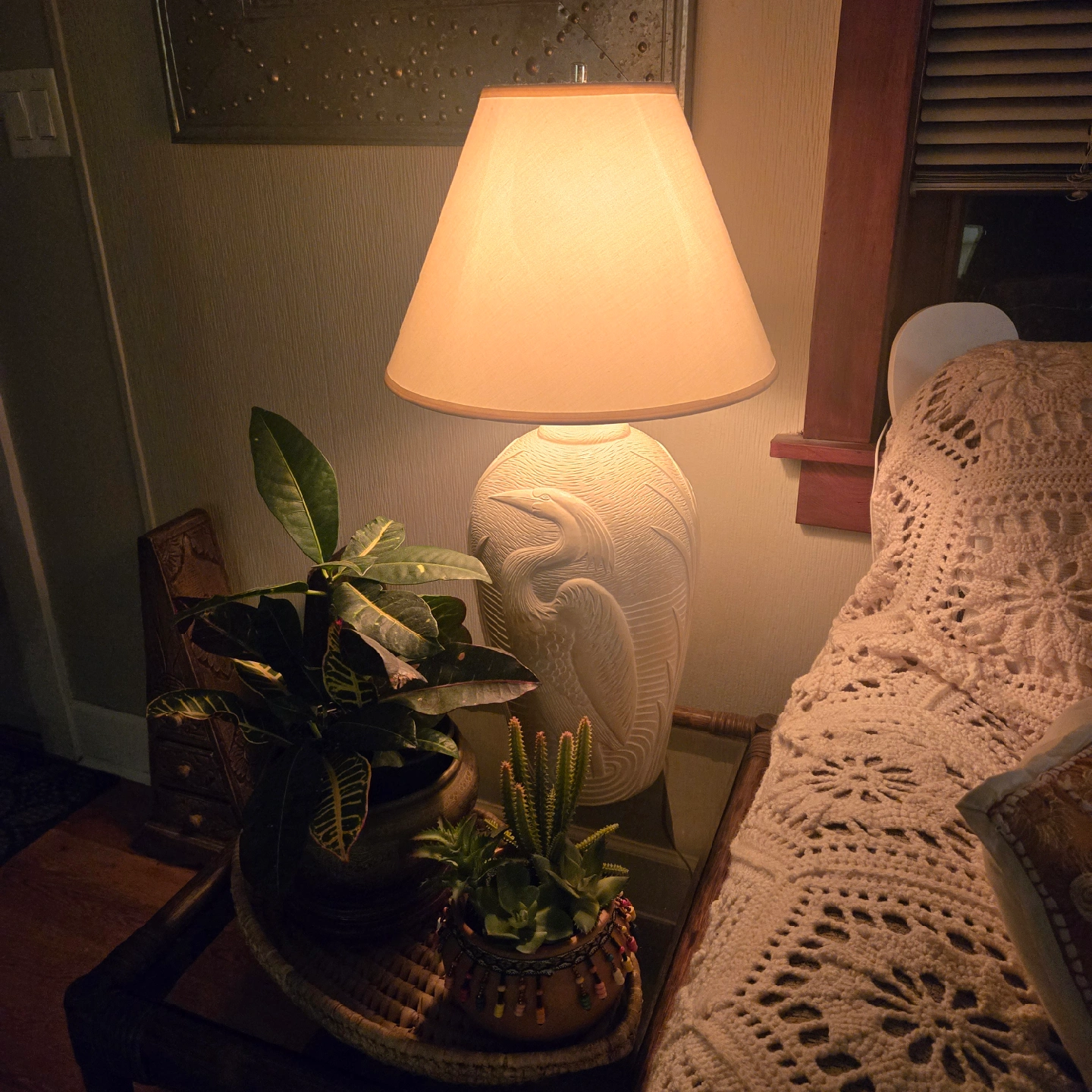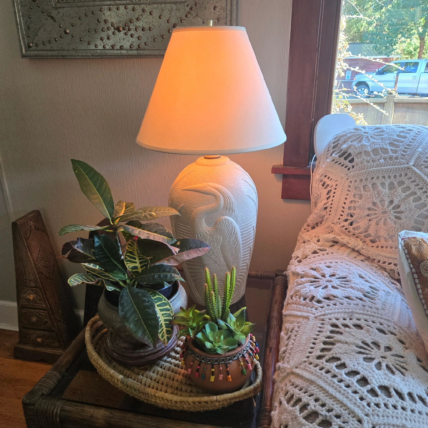 This collectible retro 1970s 80s lamp features a calming cream colour ceramic heron design. • Heron Pottery Tall Table Lamp". • lamp height 27" • lamp diameter 9" at widest • lamp diameter 6" at base • shade height 12.5" • shade diameter 20"