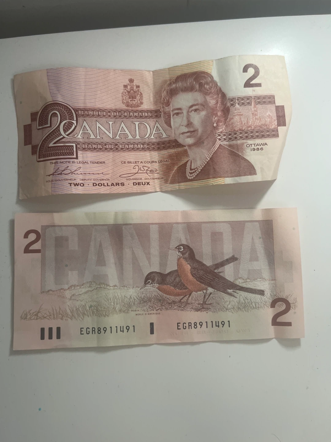 Selling a vintage Canadian two-dollar bill from 1986. It features Queen Elizabeth II and a pair of robins. A cool piece of Canadian history! (9 dollars each)