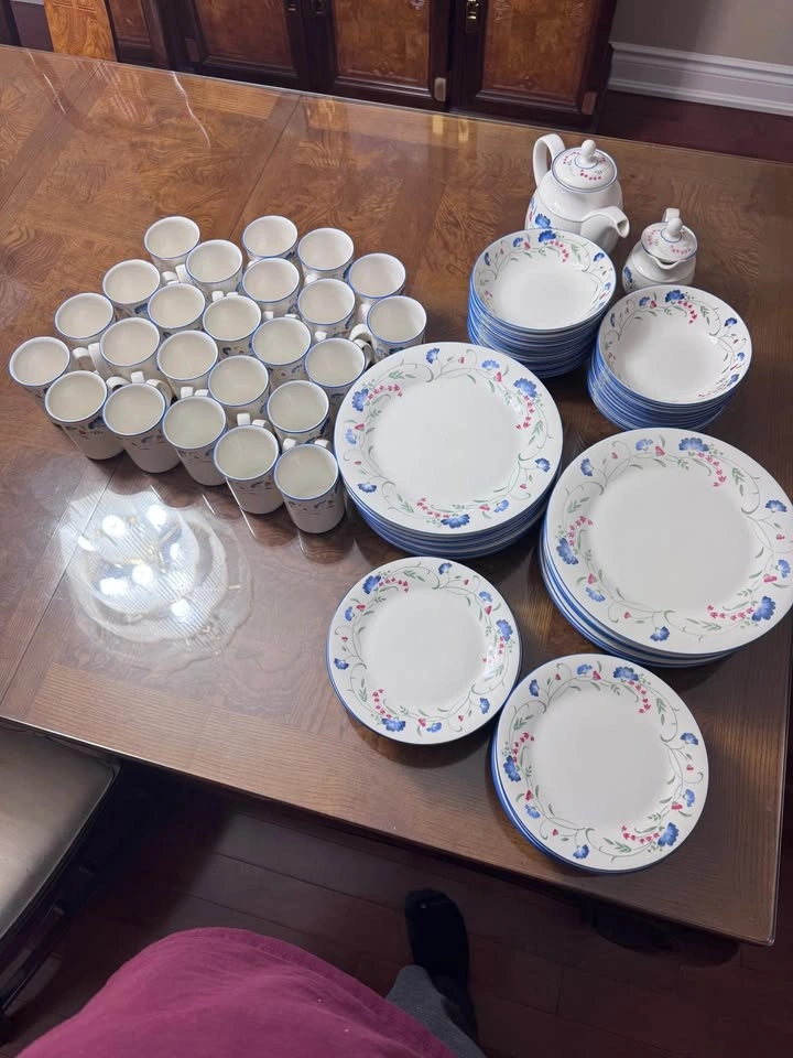 Bring timeless elegance to your dining table with this stunning vintage 90s bone china set. Each piece features a delicate floral design with soft pinks, blues, and greens along the edges, creating a classic and graceful look perfect for both everyday dining and special occasions. What’s Included: • 24 Dinner Plates • 24 Side/Salad Plates • 24 Soup/Serving Bowls • 24 Tea Cups • 1 Large Teapot with Lid • 1 Sugar Bowl with Lid (That’s a total of 98 pieces!) Features: • Genuine 1990s Bone China – lightweight yet durable • Elegant floral border design, timeless vintage charm • Perfect for large gatherings, entertaining, or as a collector’s set • Rare to find a complete set in such excellent condition Ideal for collectors, vintage lovers, or anyone looking to elevate their dining experience with a full, matching dinnerware set.