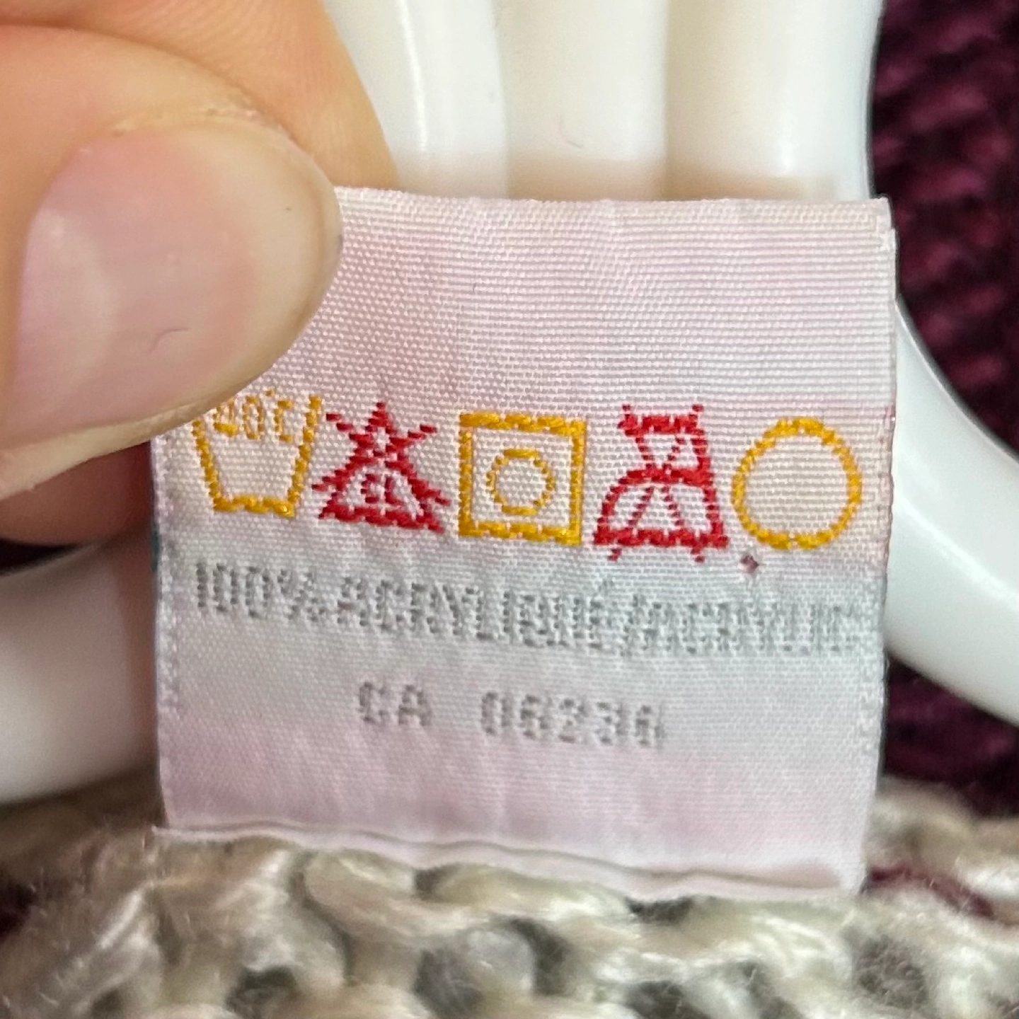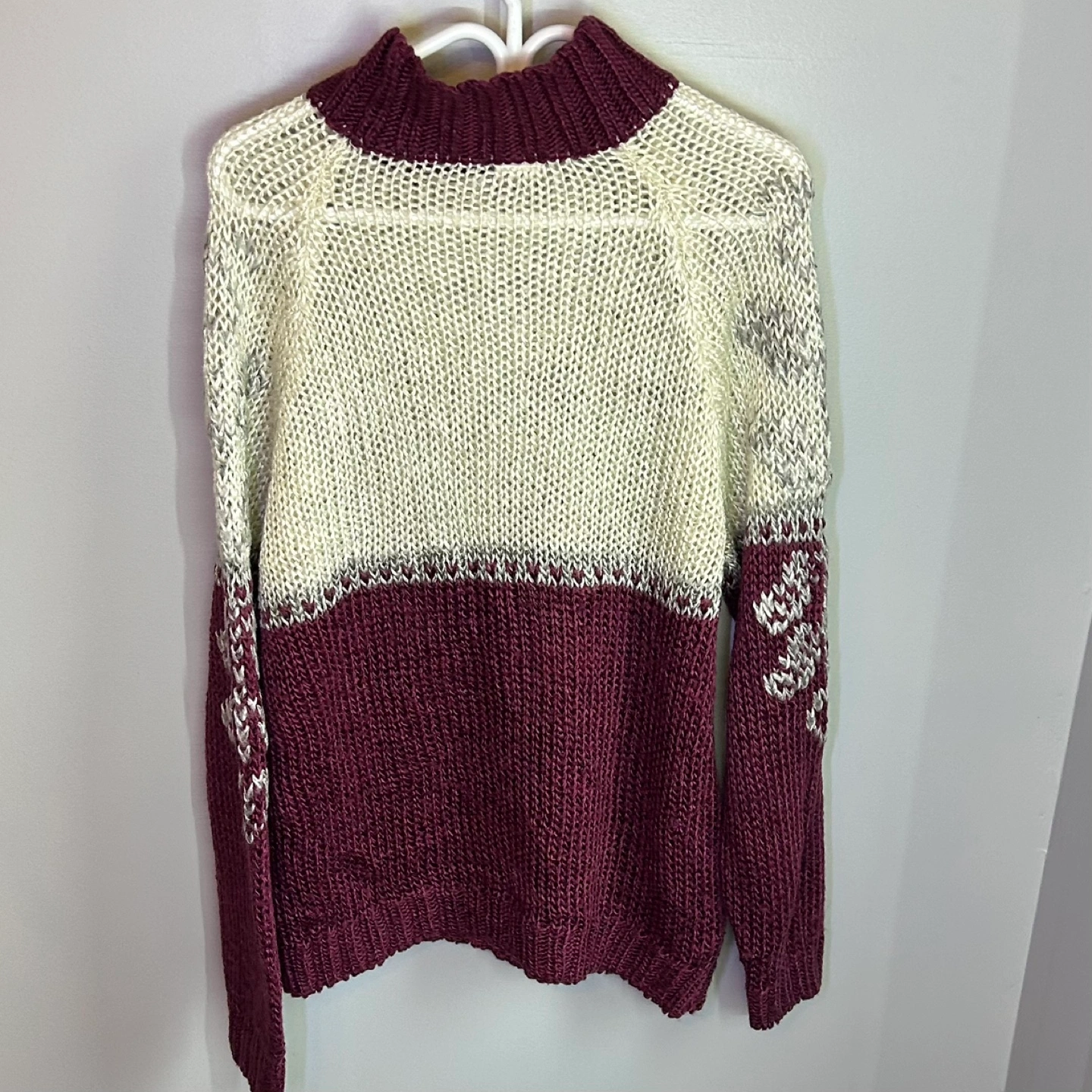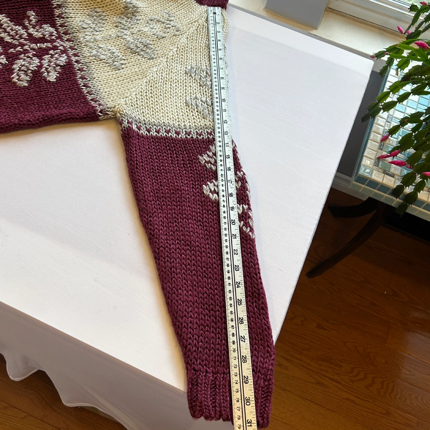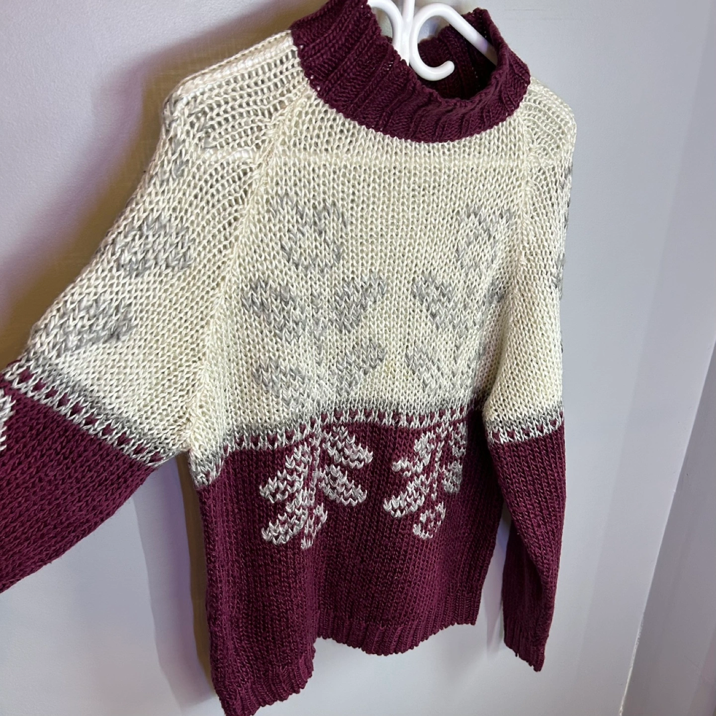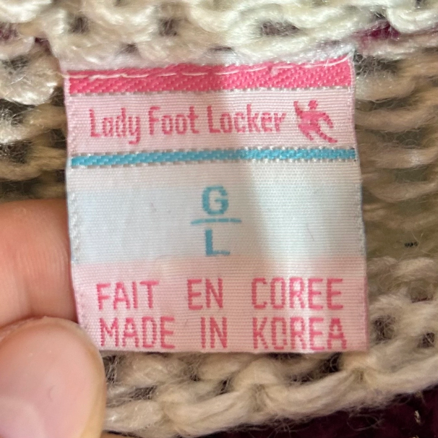 Brand: Lady Foot Locker Era: 90s, 1990s Color: Cream, Grey, Burgundy Print: Knit Floral, Colorblock Material: Acrylic Condition: Excellent Used Condition Size: L (oversized) See photos for measurements. Flaws: None Cross posted. Pickup only. Located 2 blocks west of Polo Park. Shipping options available message me for details.