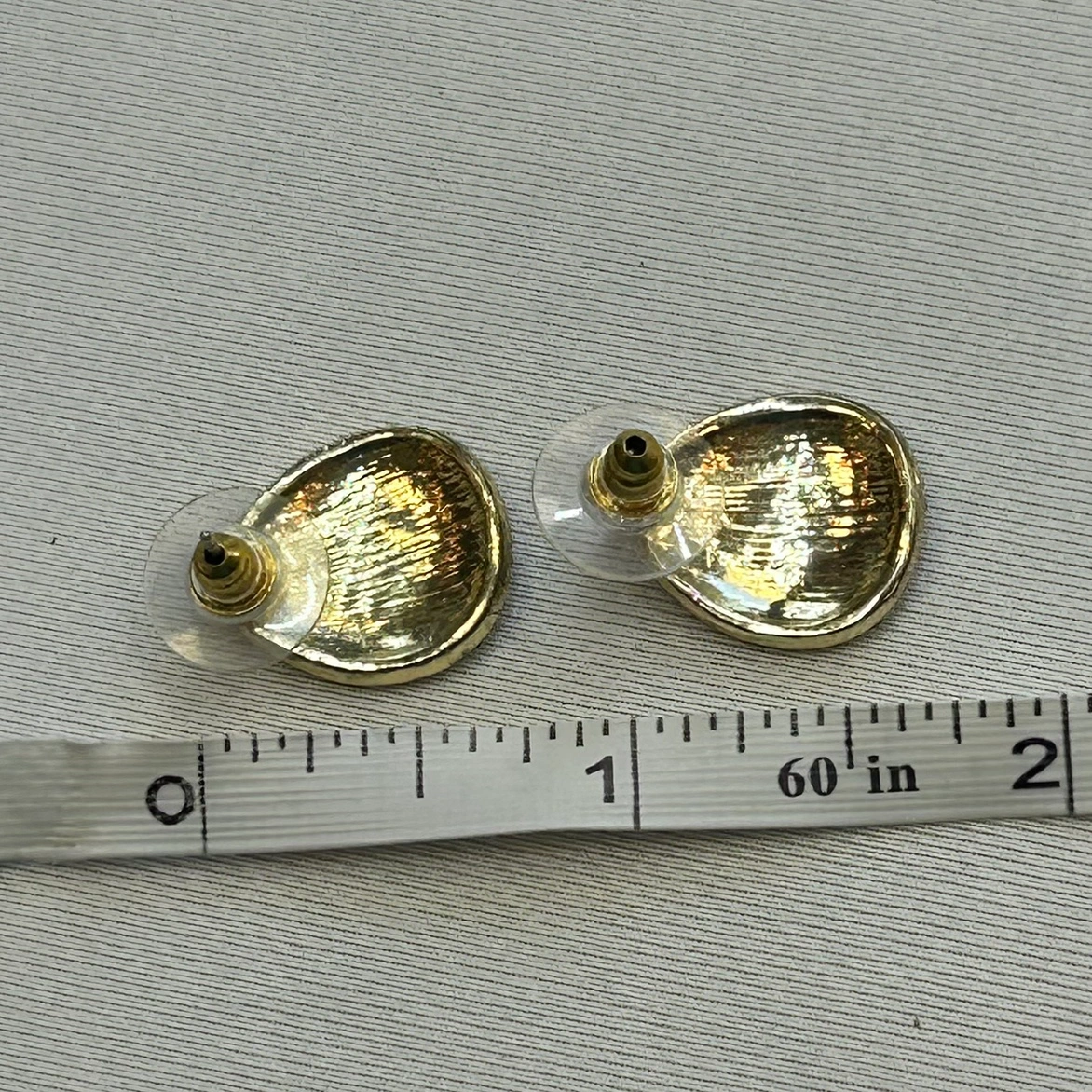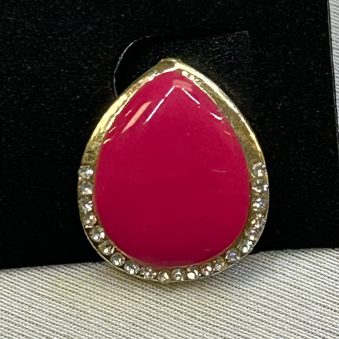 Elegant teardrop-shaped vintage 90s earrings featuring a vibrant pink enamel center, embraced by a delicate ring of sparkling rhinestones. The rich gold-tone setting adds a touch of sophistication, making these earrings an ideal accessory for both day and night ensembles. Their lustrous charm and statement design can effortlessly elevate any outfit. Worn only a few times. See photos for measurements. Cross posted. Pick up only. Located 2 blocks west of Polo Park. Shipping options available message me for details.