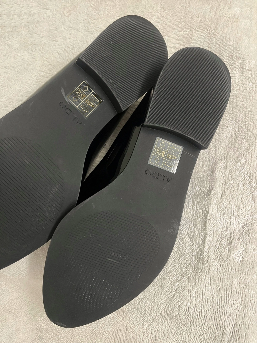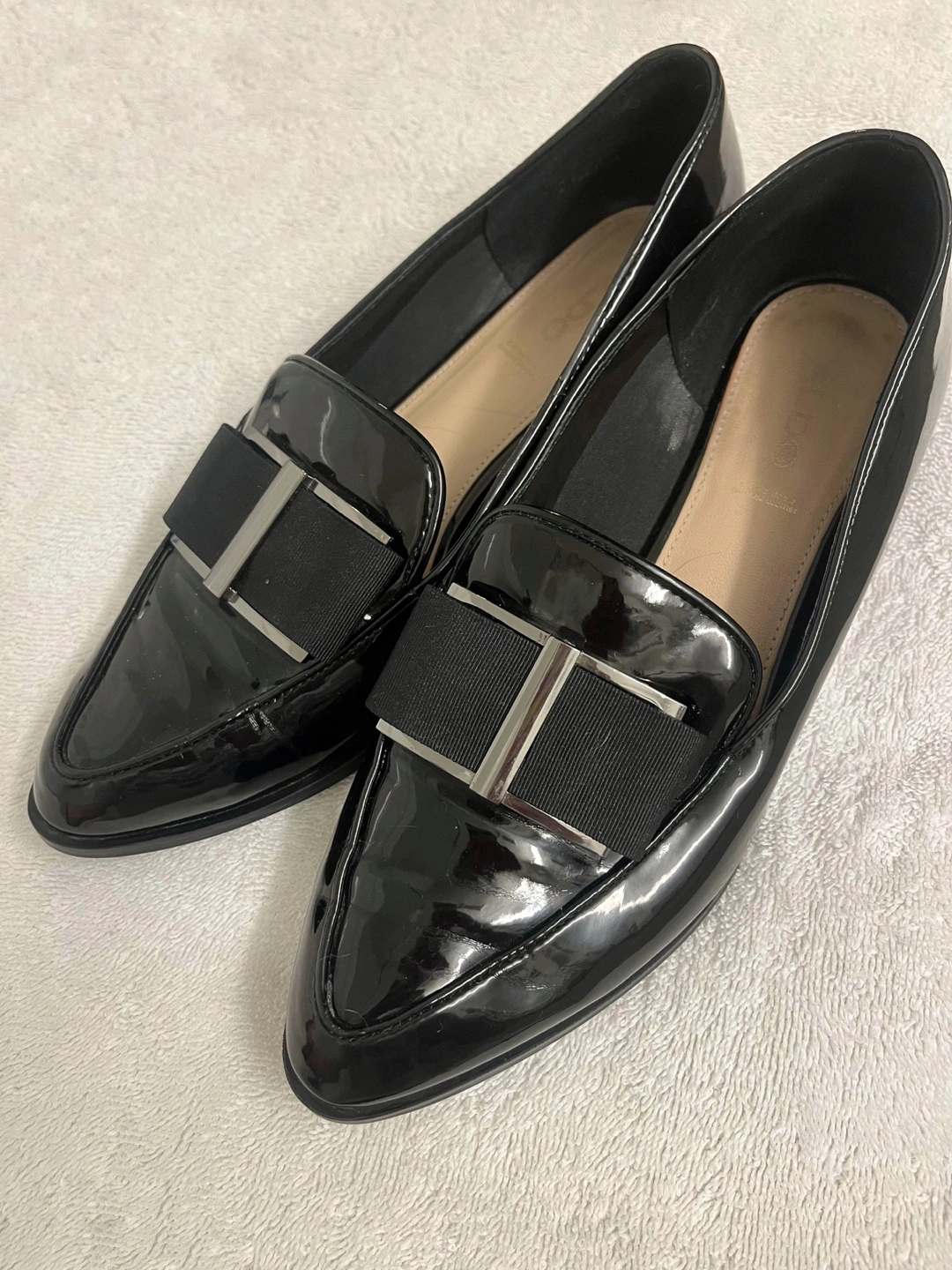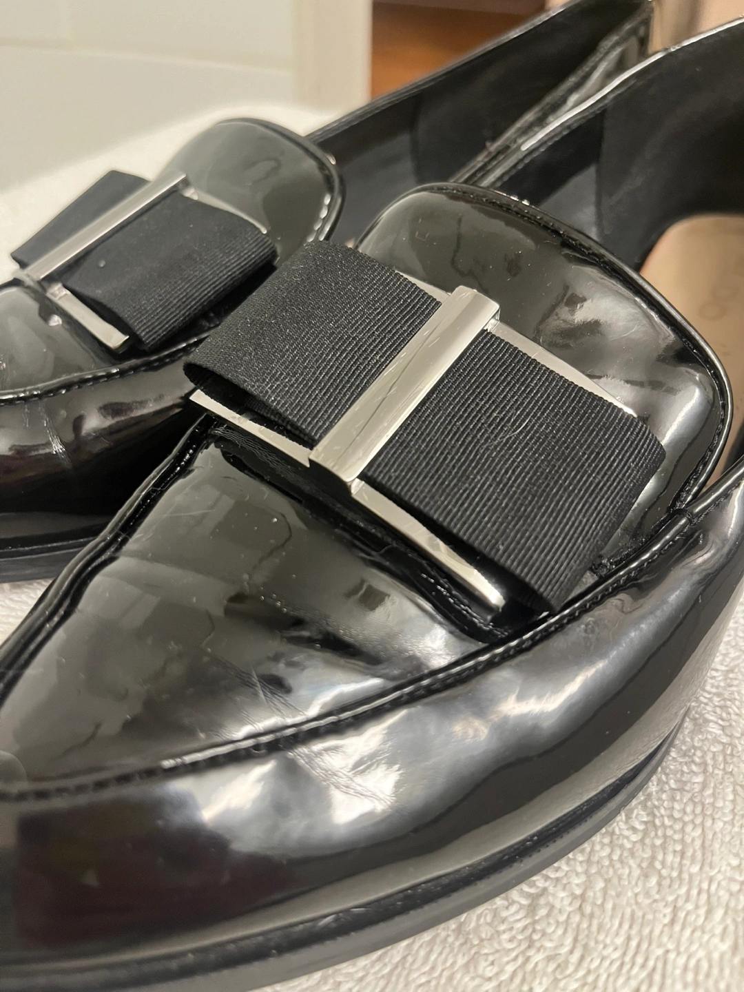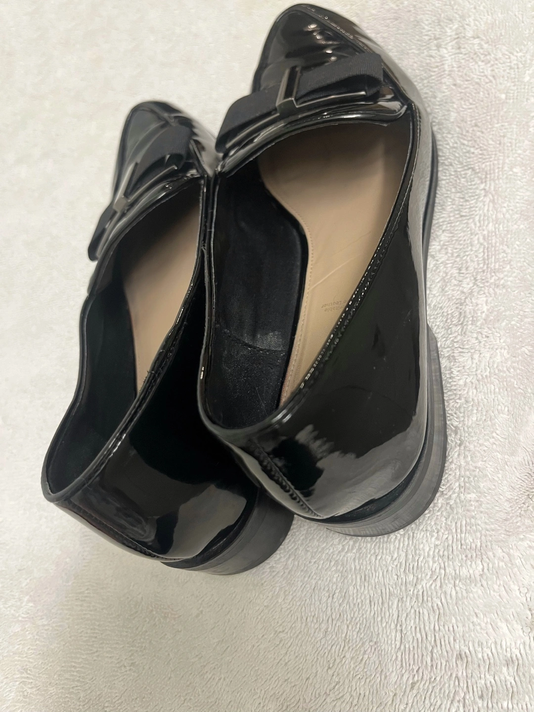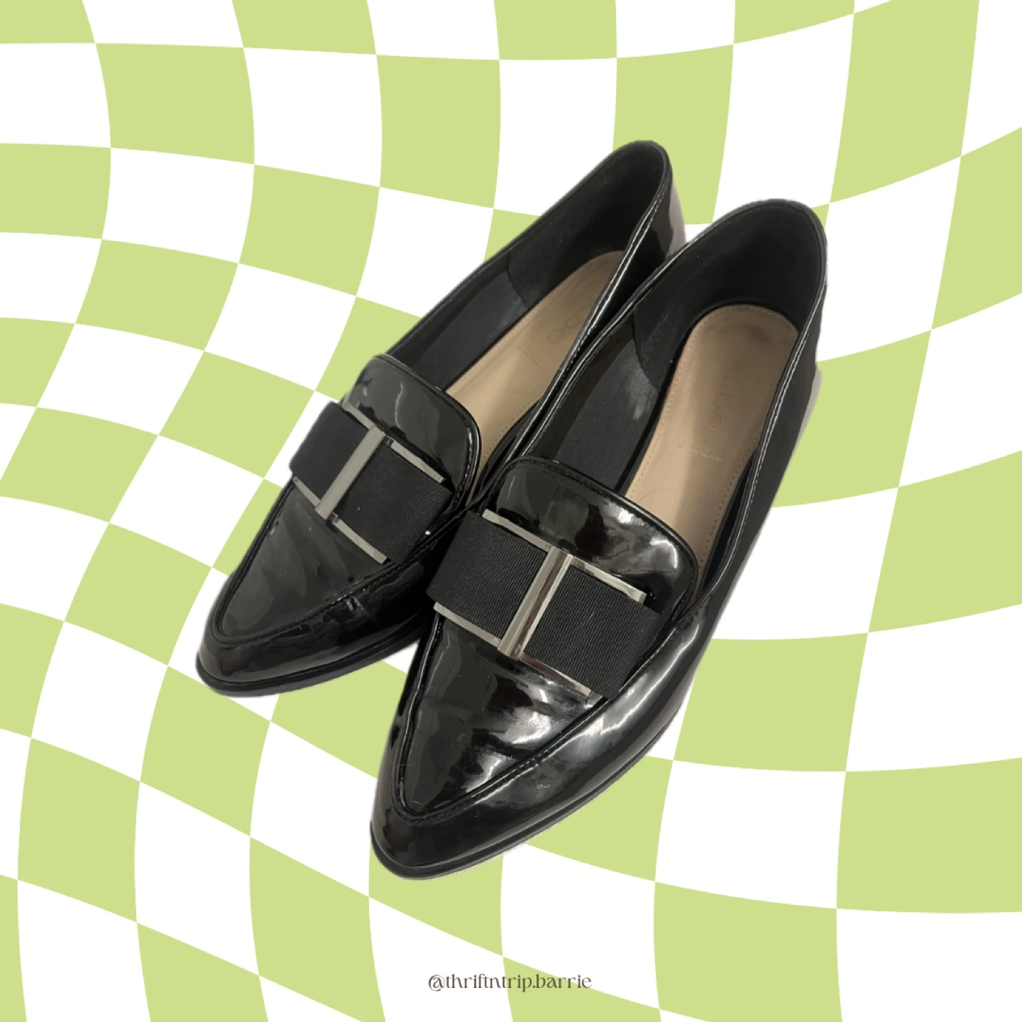 Black patent leather loafers with a black grosgrain ribbon and silver buckle. Size 8. Great used condition. Vintage.