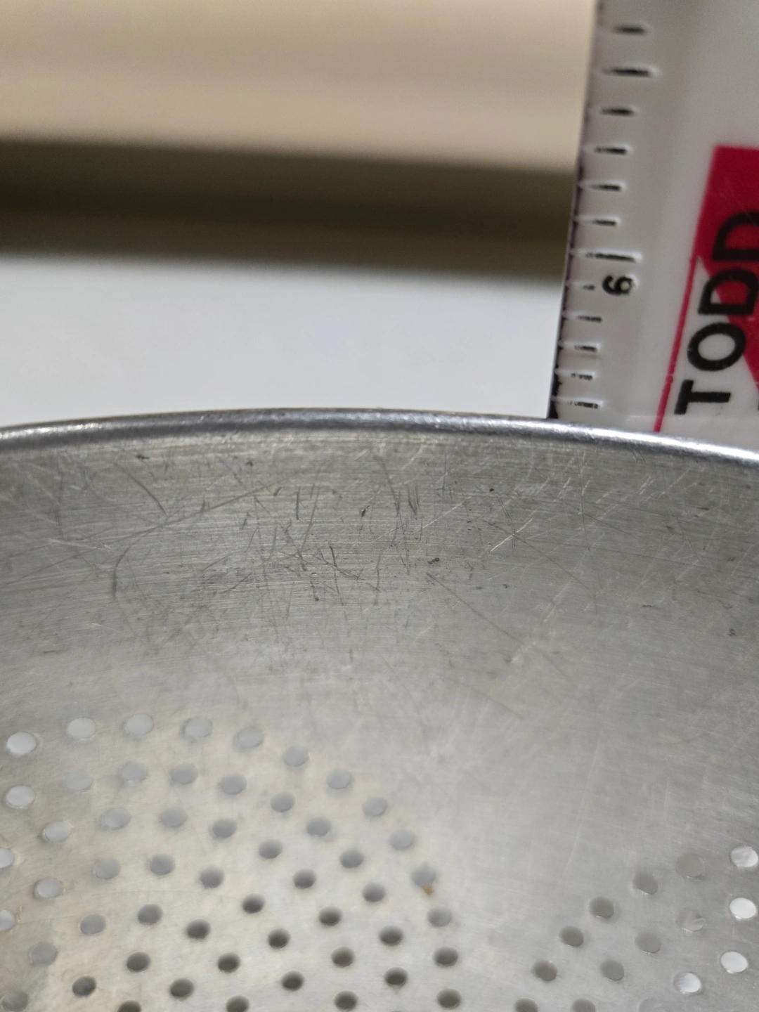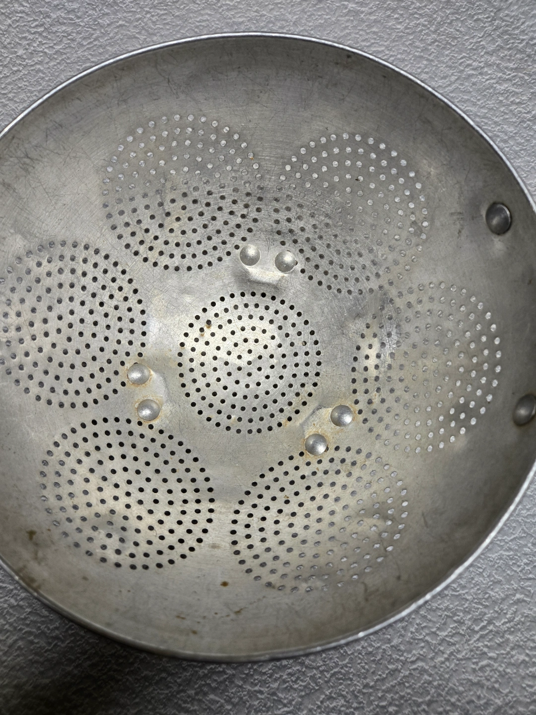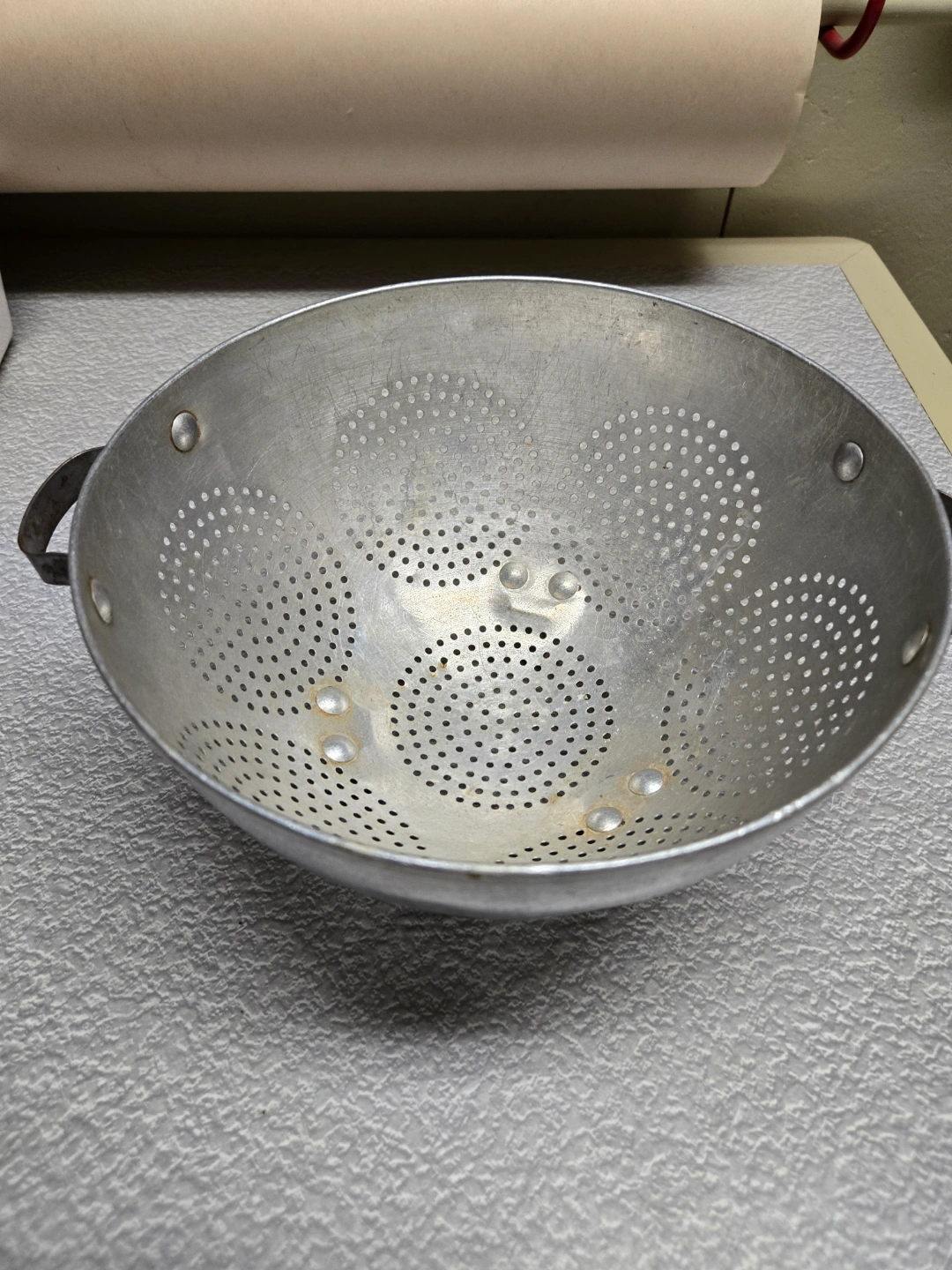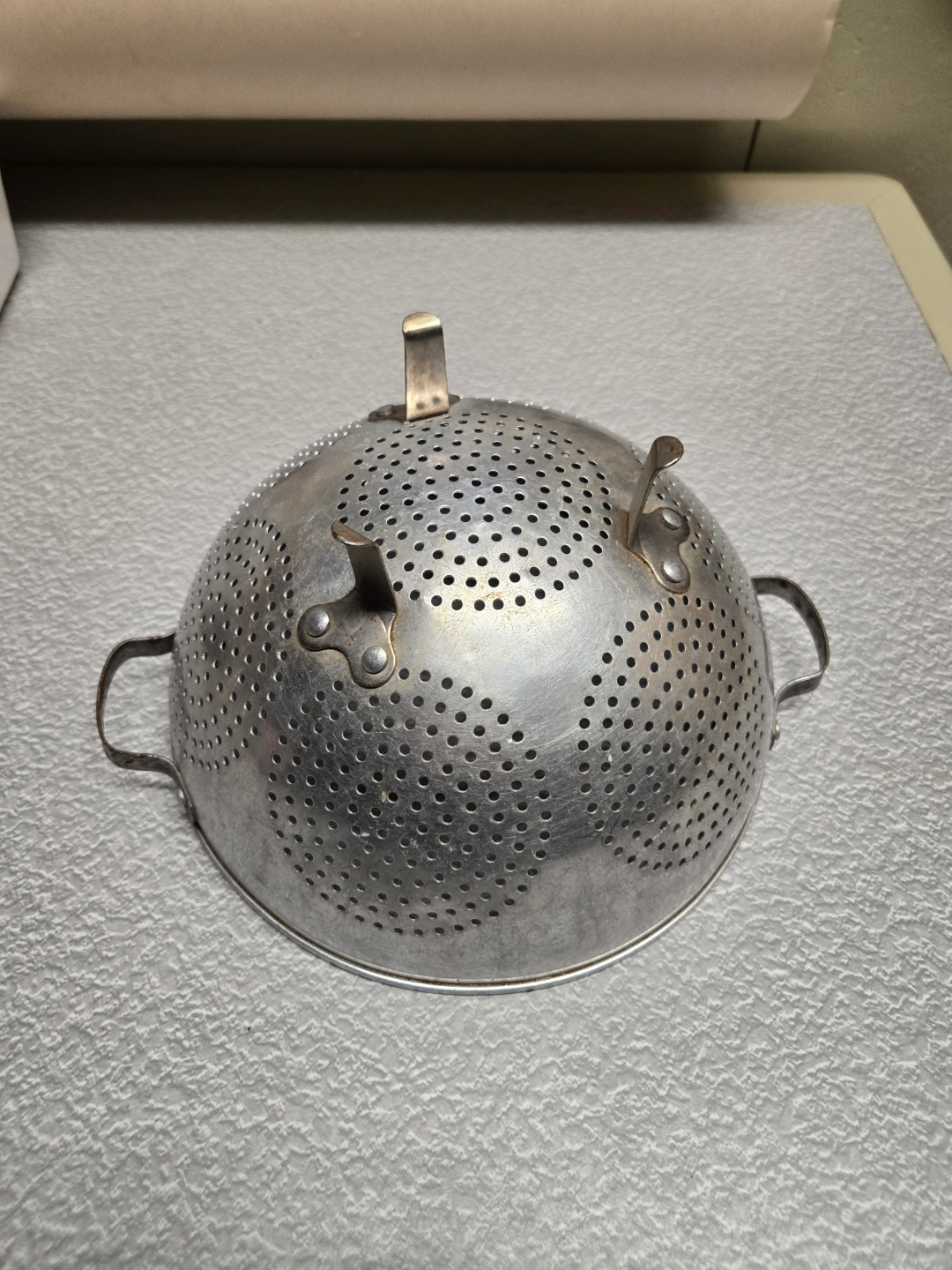 Metal colander, three legs, two handles. Shows wear from age and use. Great for draining pasta or washing vegetables.