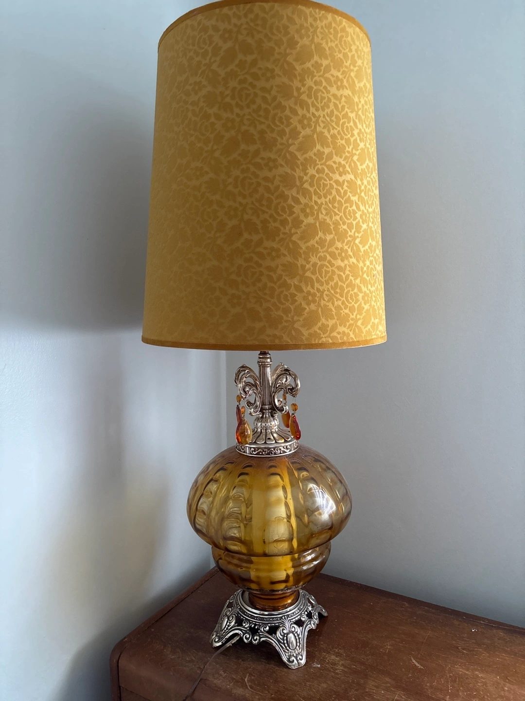 Beautiful vintage table lamp. Features an amber glass body and ornate silver-tone base. Comes with a coordinating yellow floral lampshade. Mid-century modern style. Cord needs repair.