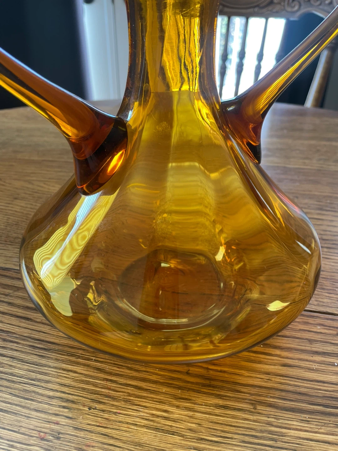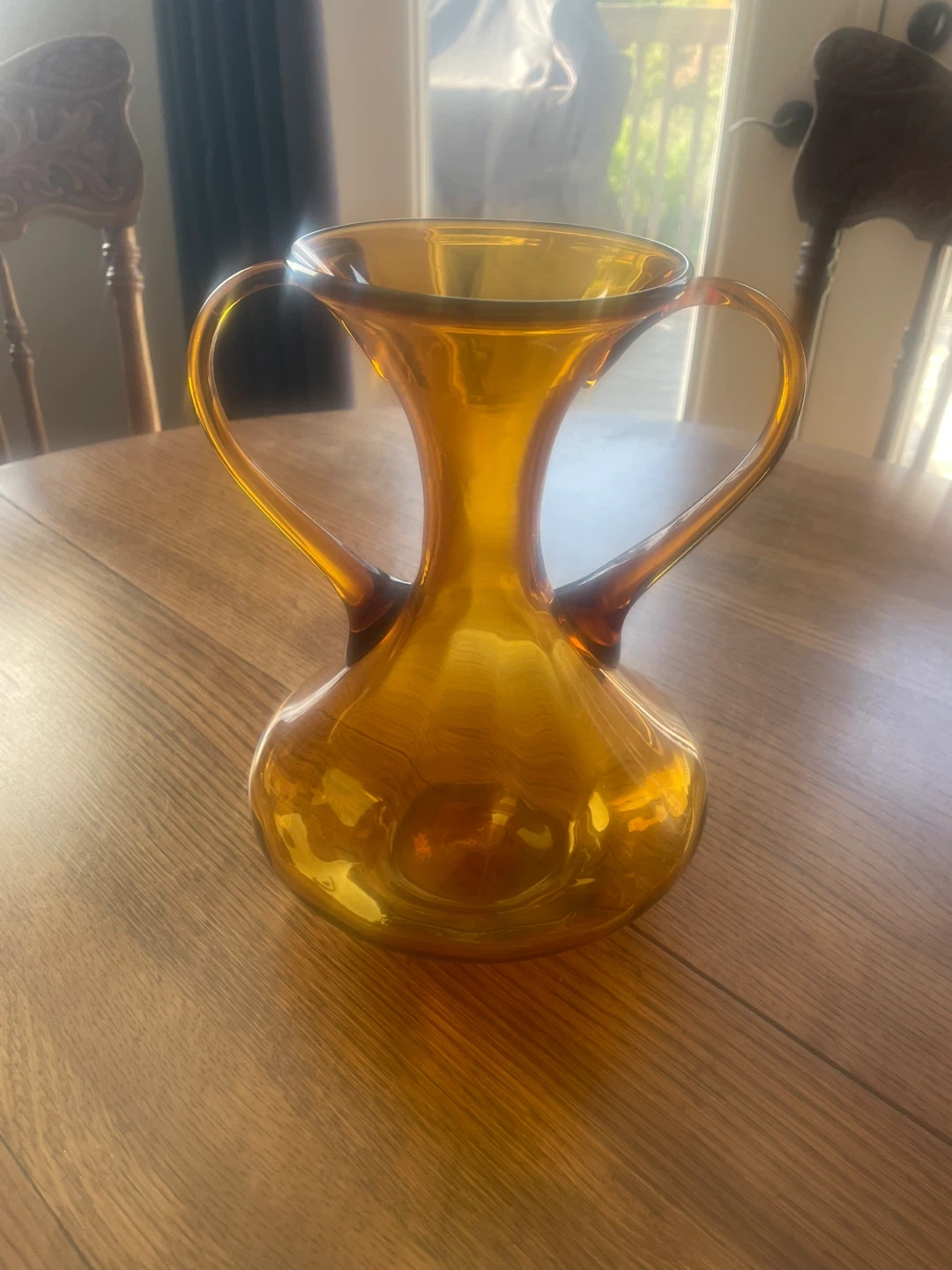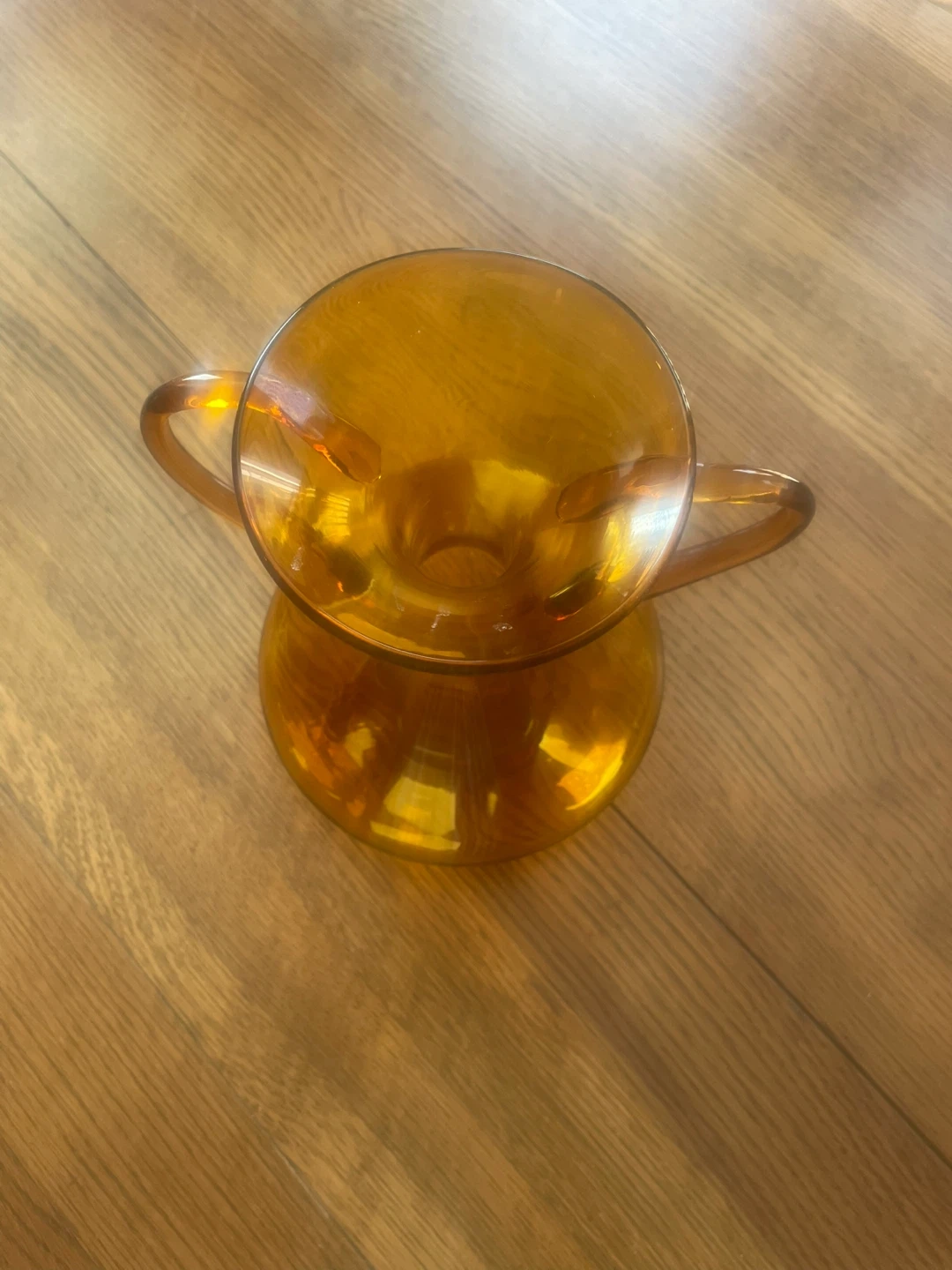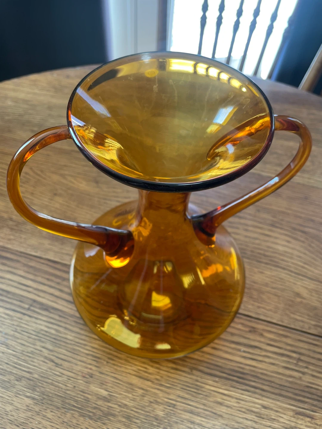 Beautiful amber-coloured glass vase! It features a unique design with handles on either side. It would look great as a centrepiece or to add some colour to any room approximately 10” tall
