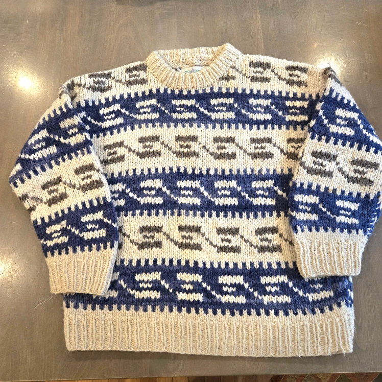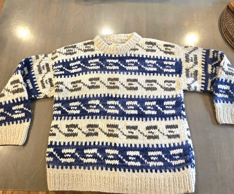 Cozy up in this unique Vintage Amos & Andes sweater! It's made of 100% wool and features a lovely pattern in shades of cream, blue, and grey. Perfect for staying warm and stylish on chilly days. Men's Size Large