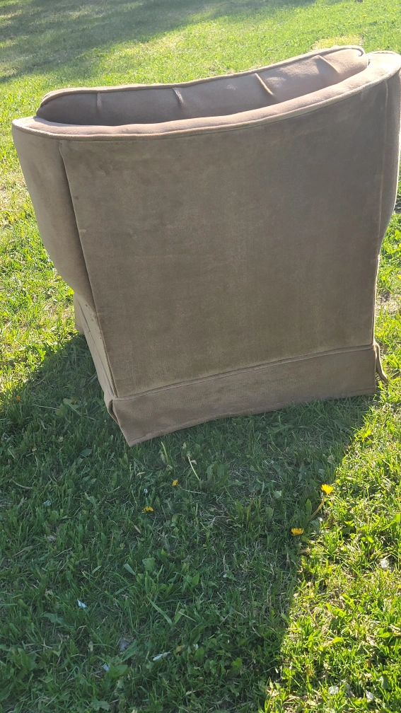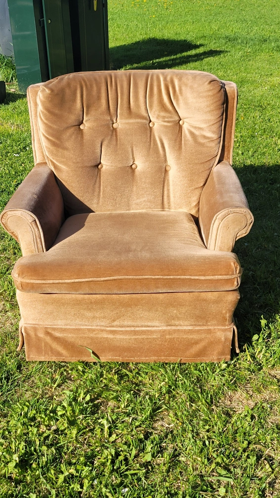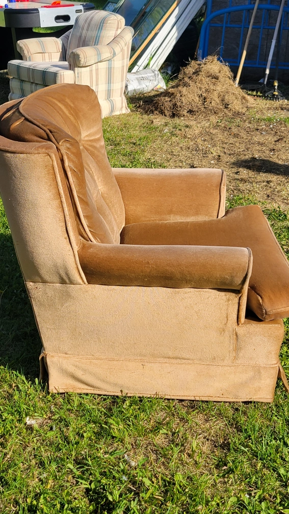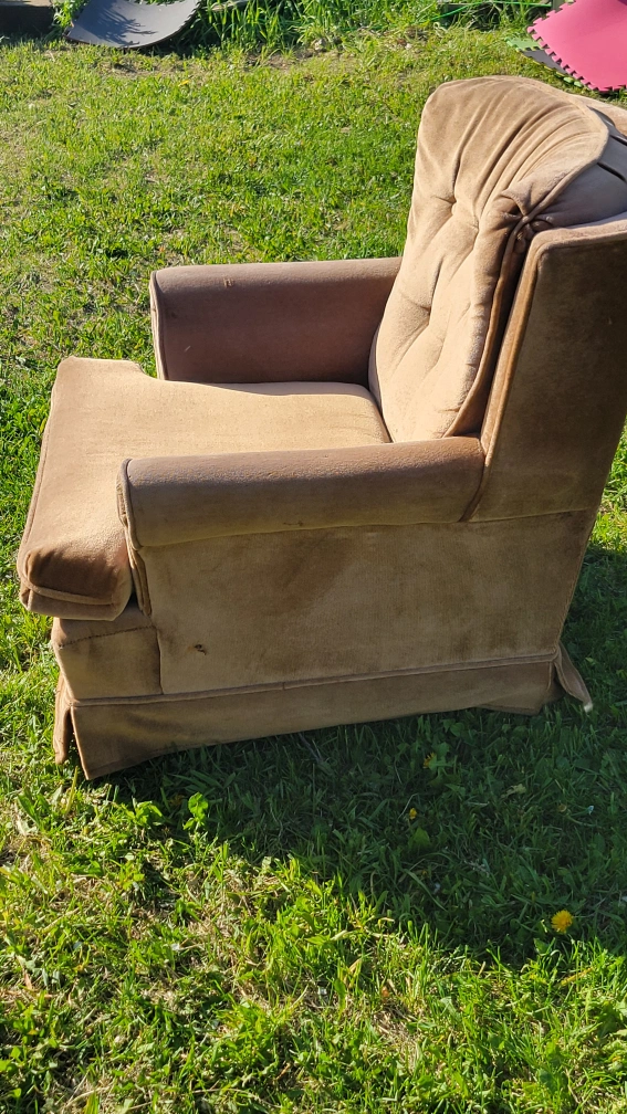 A cozy armchair with a plush seat and backrest. Features rolled armrests and a skirted base. The backrest has a button-tufted design. Consider this your new reading nook where you can escape from the world. Asking $50