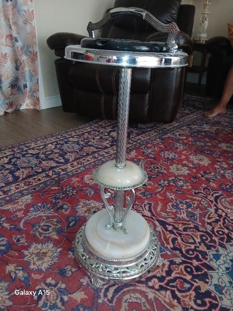 Selling a vintage ashtray stand. It features a chrome finish with white marble accents. It's a unique piece that would add a touch of retro style to any room. it is art deco from mid 20th century.