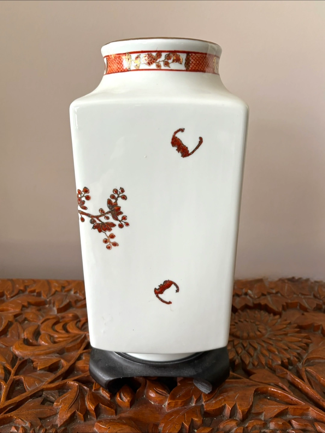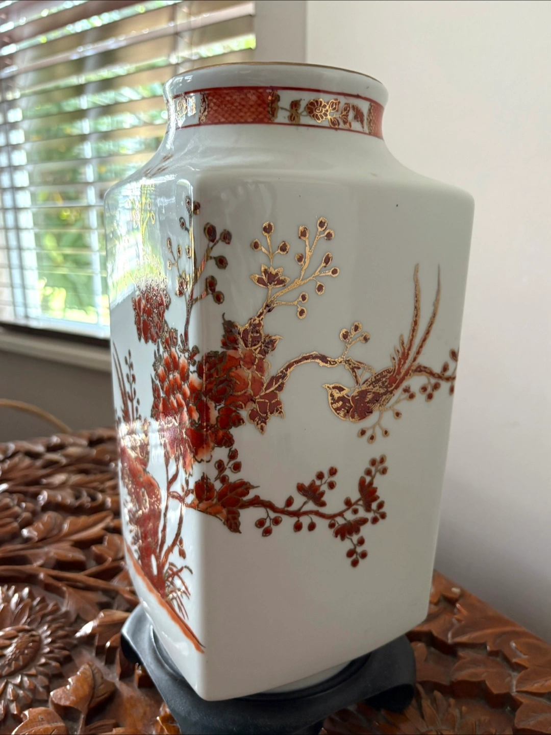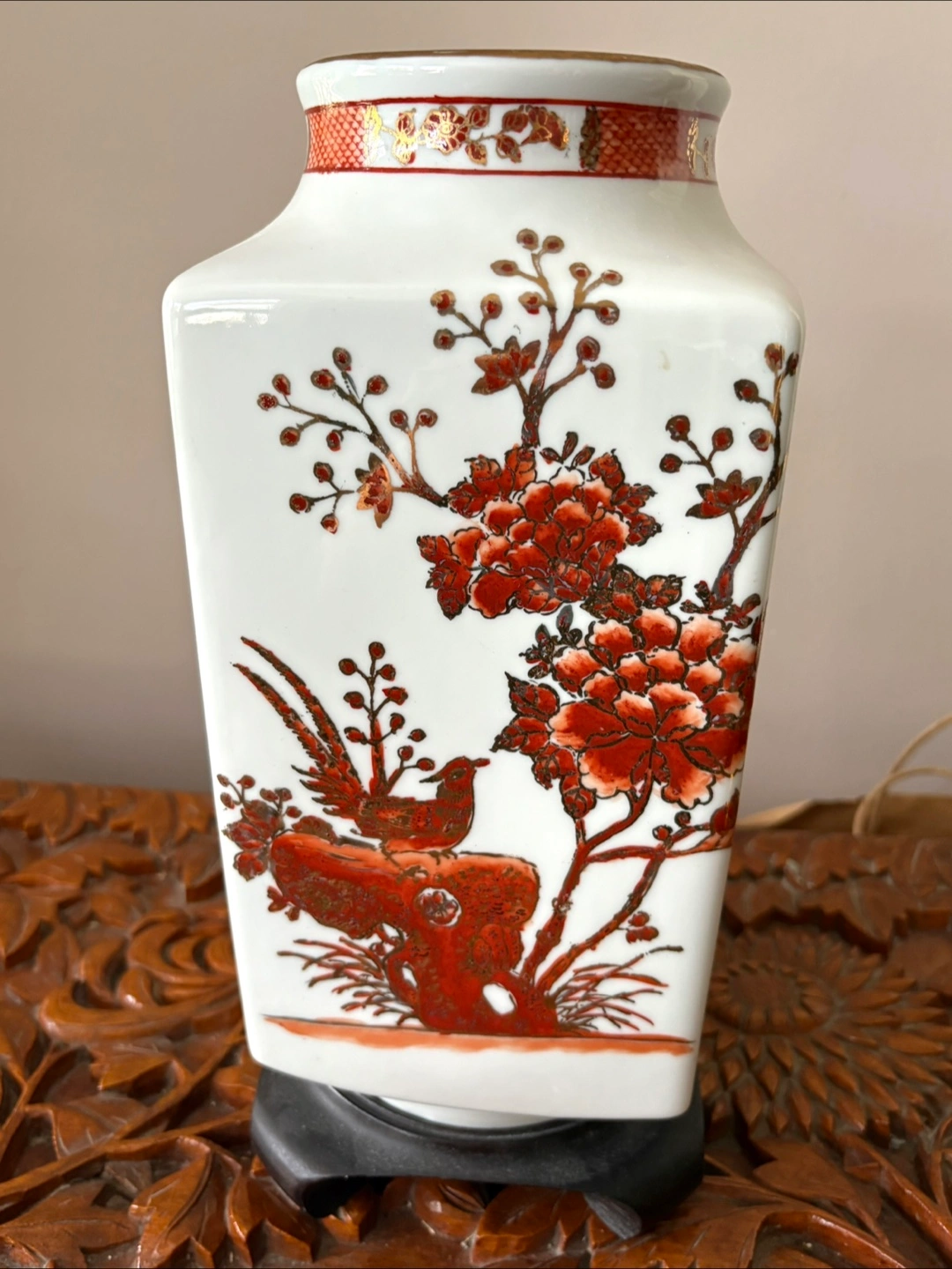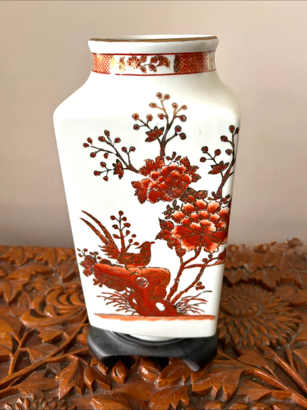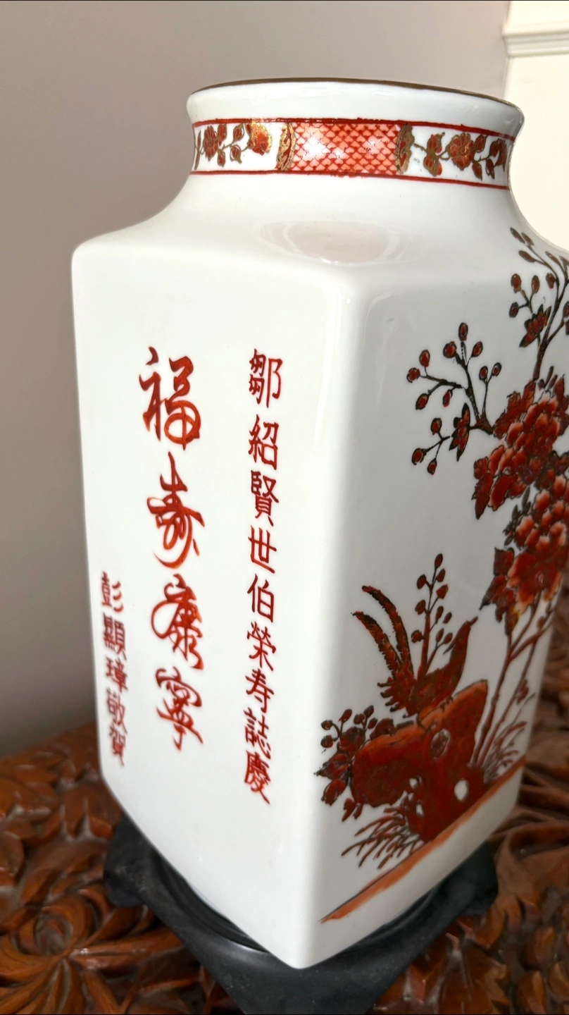 A beautiful vintage Asian vase. It features a lovely floral and bird design in red and gold tones on a white background. A unique piece to add to your home decor! Vase is 12” tall in square shape 6” x 6” Comes with the original wooden stand .