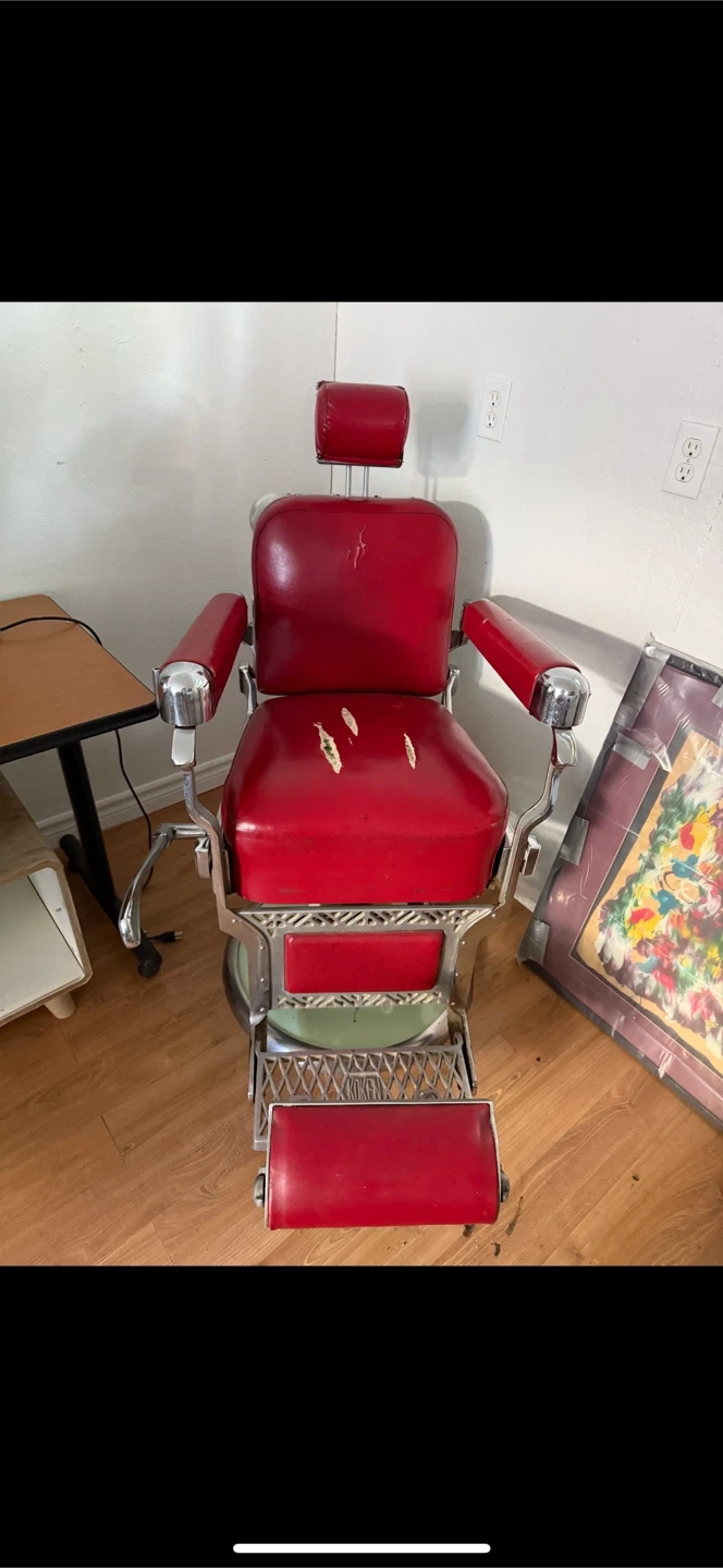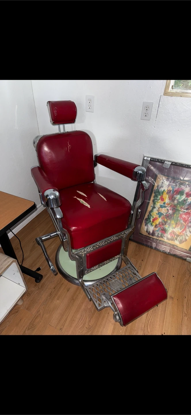 Selling a vintage barber chair with a classic red finish. It shows some signs of wear, as seen in the photos, but still has a lot of character. Perfect for a vintage-themed barbershop or as a unique statement piece!