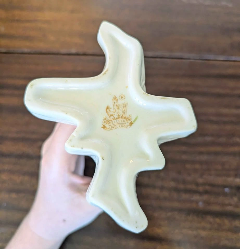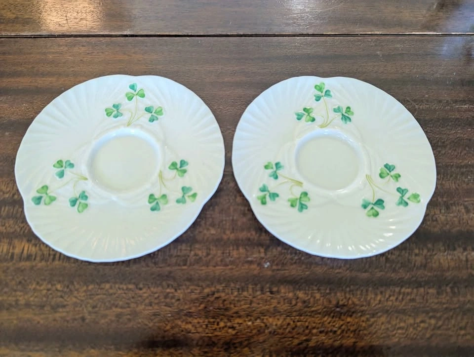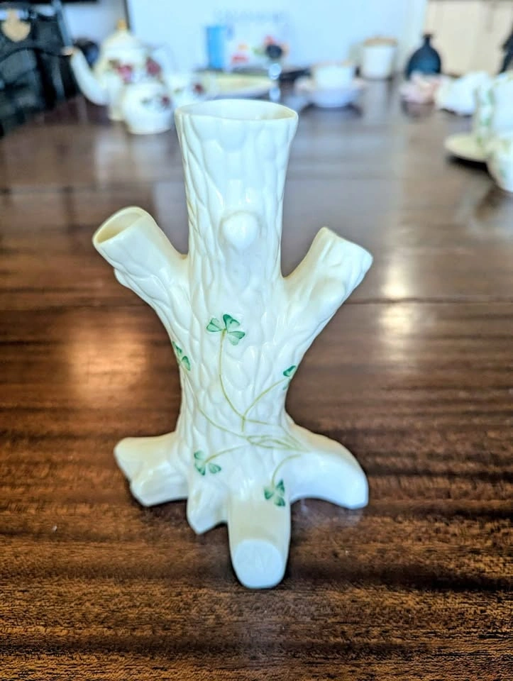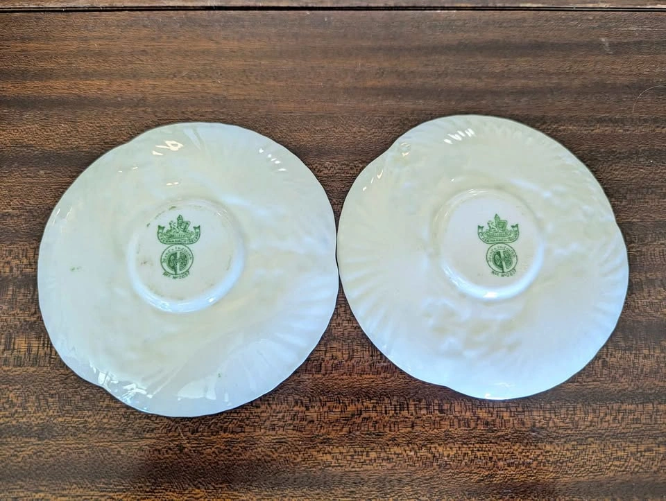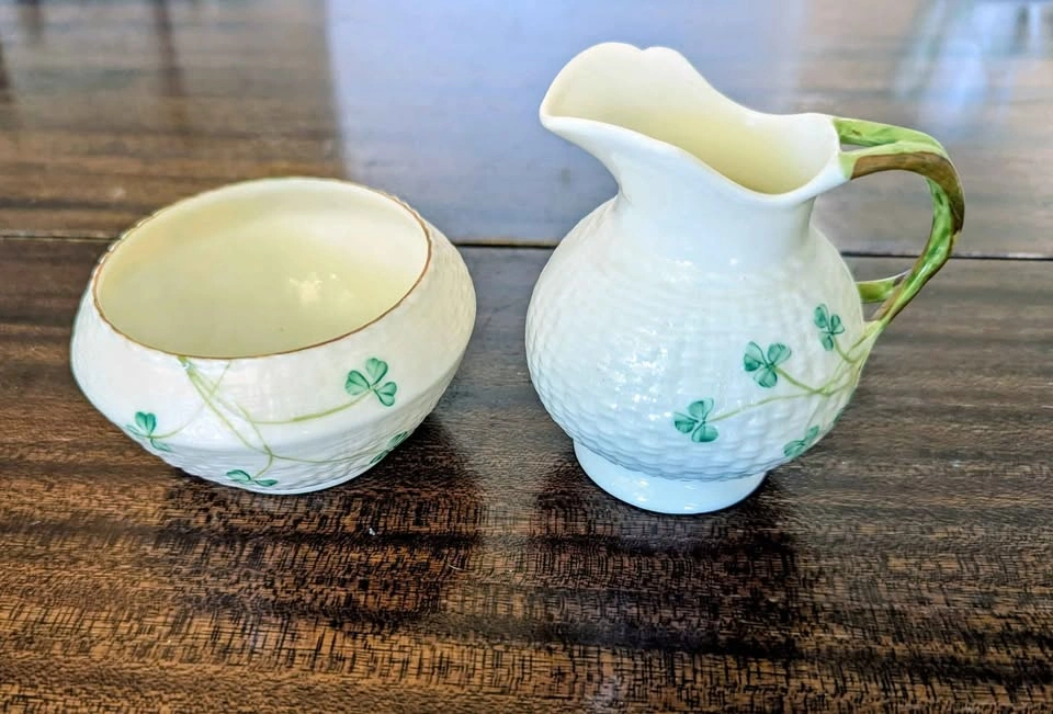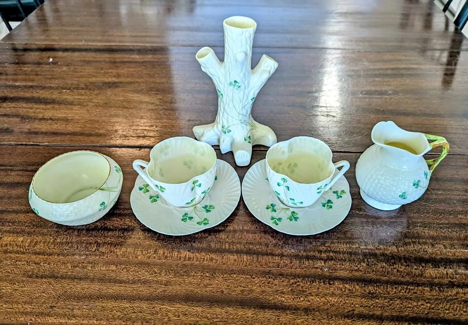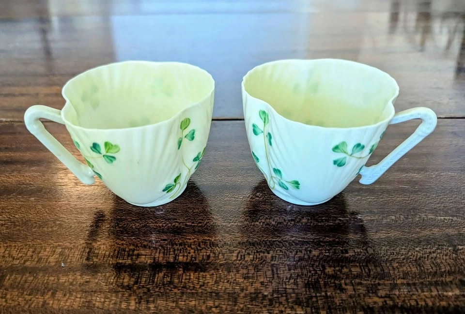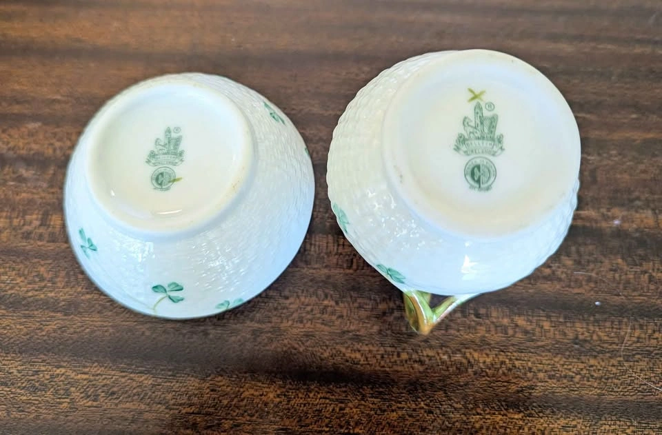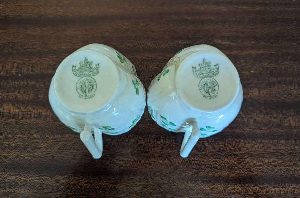 Collection of Belleek porcelain items, primarily featuring the iconic Shamrock pattern. Belleek Shamrock Tea Set Components: The set includes two teacups and saucers, a sugar bowl, a creamer, and a unique three-spout vase. The items are adorned with the distinctive hand-painted Irish shamrock design and a basket weave texture, a hallmark of Belleek's craftsmanship. These pieces are crafted from Fine Parian China, known for its smooth, marble-like finish. Belleek porcelain is handmade and hand-painted in Ireland, reflecting a tradition of over 160 years of Irish artistry. Tea cups x2: The date of production for these specific backstamps falls within the 6th Mark period (Green Mark), which typically ranges from 1965 to 1980. Saucers x2: Based on the back stamps visible, the Belleek pieces likely bear the 5th Mark (or 2nd Green Mark), indicating a production period between 1955 and 1965. Sugar Bowl: The backstamp on the item appears to be the Fifth Green Mark, which indicates a production date between 1955 and 1965 Creamer: The backstamp visible in the image is a Belleek green mark, specifically the Fourth Green Mark, which indicates the item was produced between 1946 and 1955. Vase: This particular yellow backstamp with the R symbol is known as the 9th Mark and was used by Belleek Pottery from 1993 to 1999. No cracks or chips and items are in excellent condition for how fragile they are!