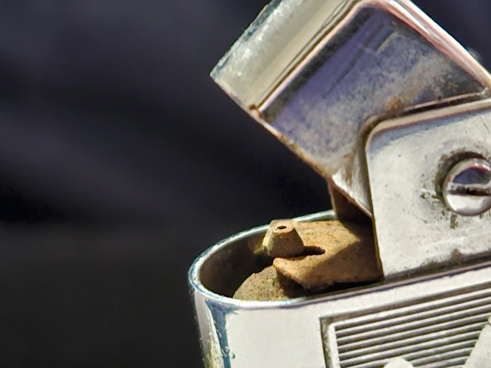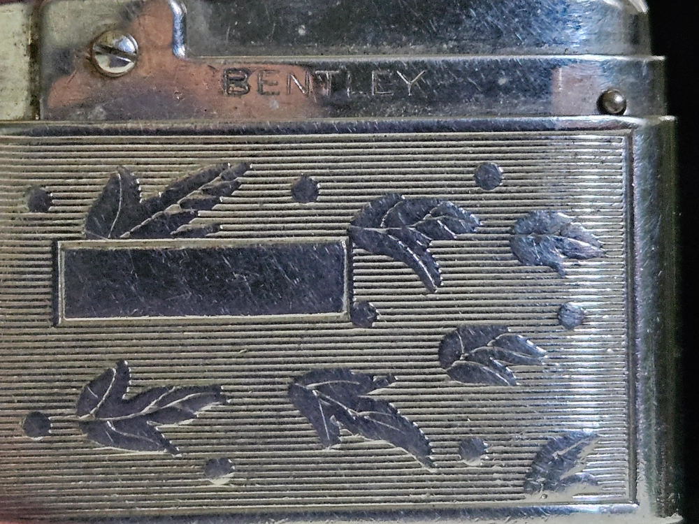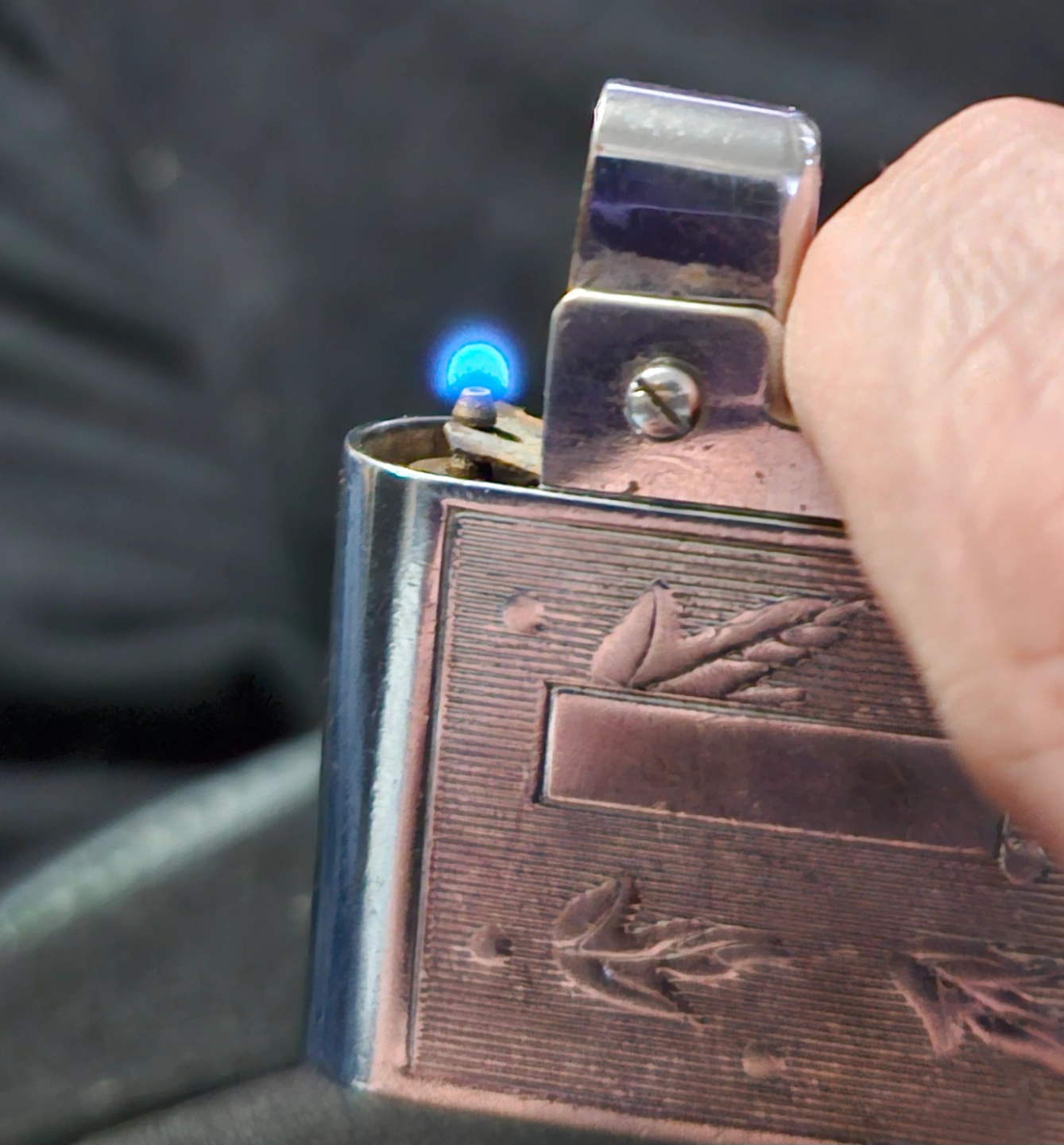 Silver-toned metal lighter. Engraved leaf design... cash preferred, no holds, no price negotiation at the door, must pick up