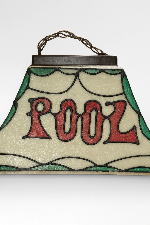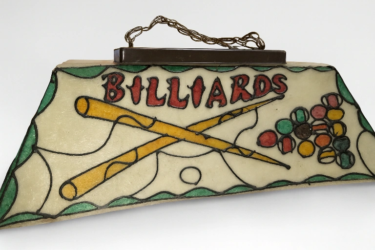 Selling a vintage billiards pool table light. It has a unique mirrored design with 'Billiards' being on both of the long sides and 'Pool' mirrored on both of the small sides, along with images of pool cues and balls. It has two light sockets on the inside, comes with hanging hardware in a chain, swag lamp style, and plugs into a regular outlet, easily hard wired if necessary.