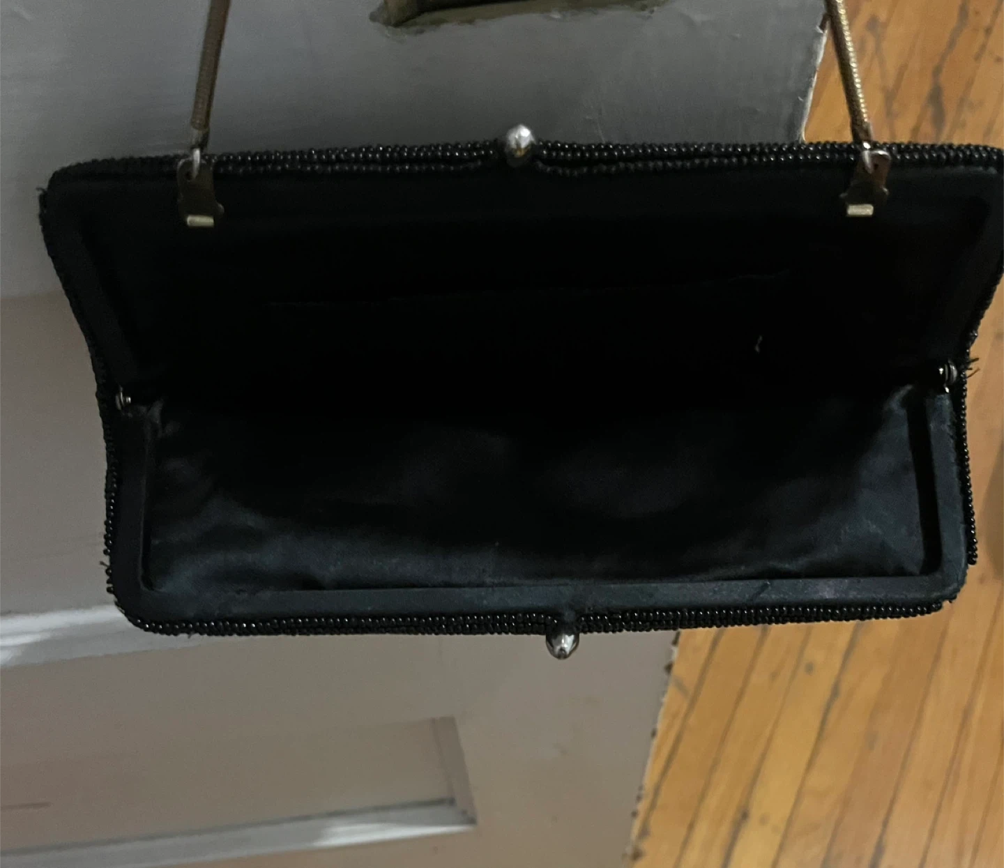 VTG Beads and Sequins Clutch Black W/ Silver Hide Away Chain Amazing condition was told late 50’s no label to tell where or who made it Cash only please