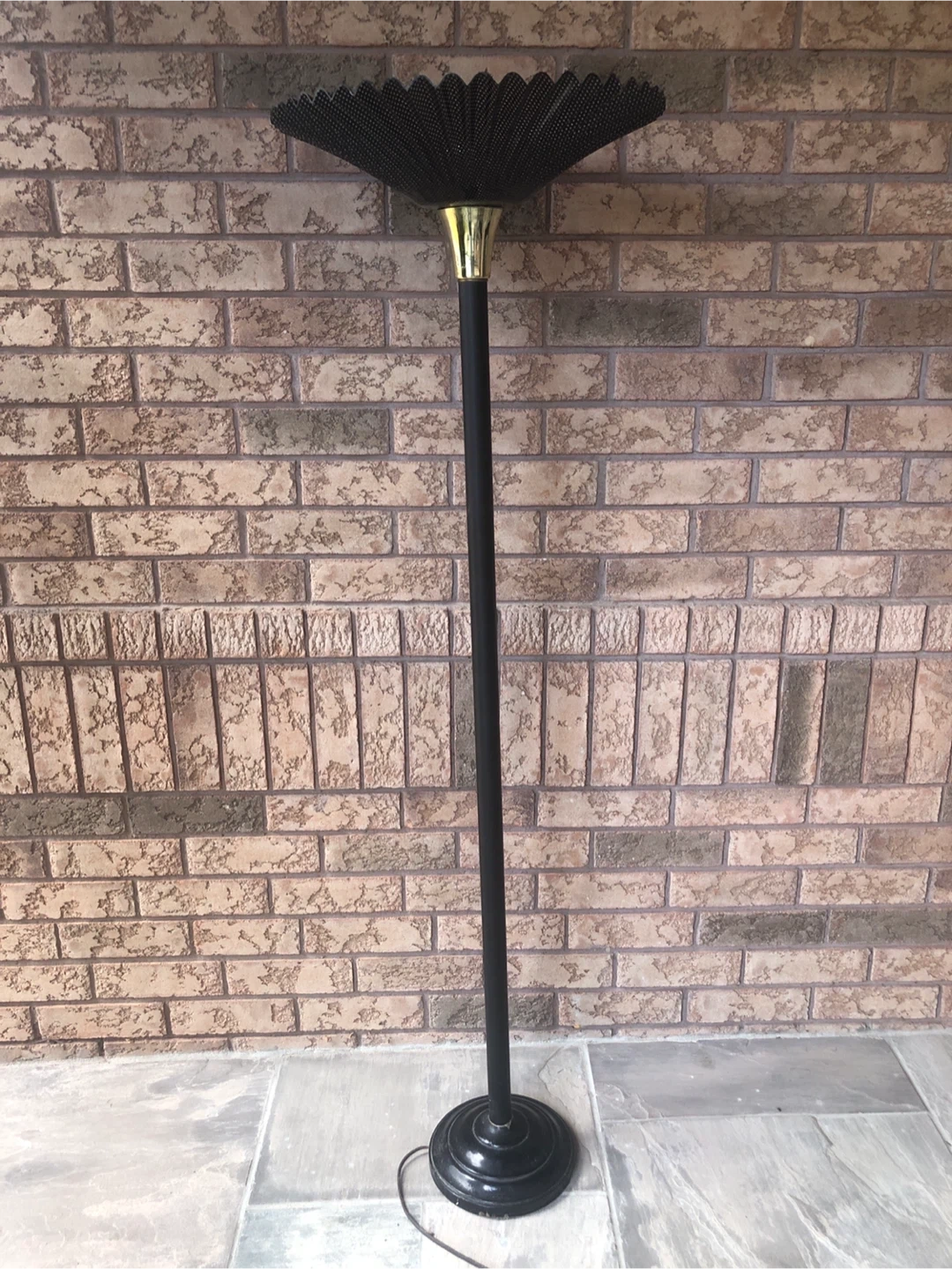 Selling a vintage floor lamp. It features a black shade with a unique, eye-catching design and a sleek black stand with gold accents. It's in great condition and would add a touch of retro charm to any room