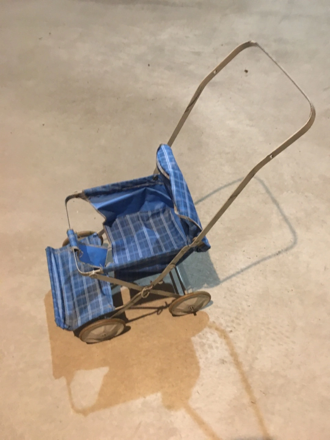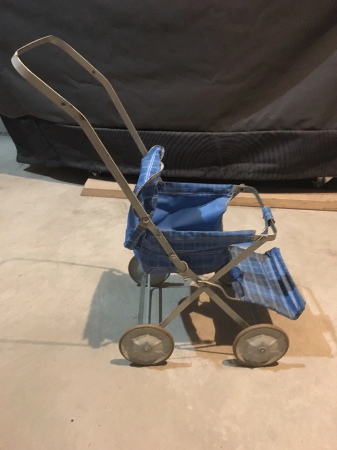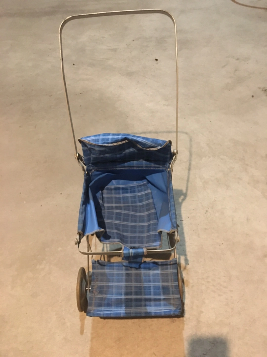 Selling a cute vintage doll stroller! It features a blue plaid fabric and a metal frame. Perfect for a collector or for a child who loves playing with dolls!