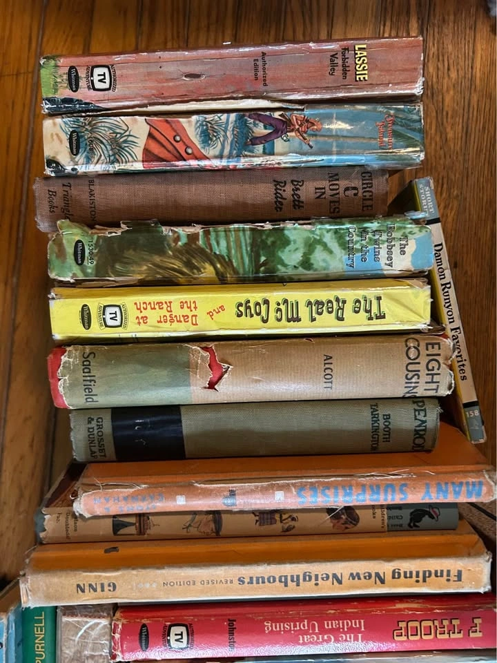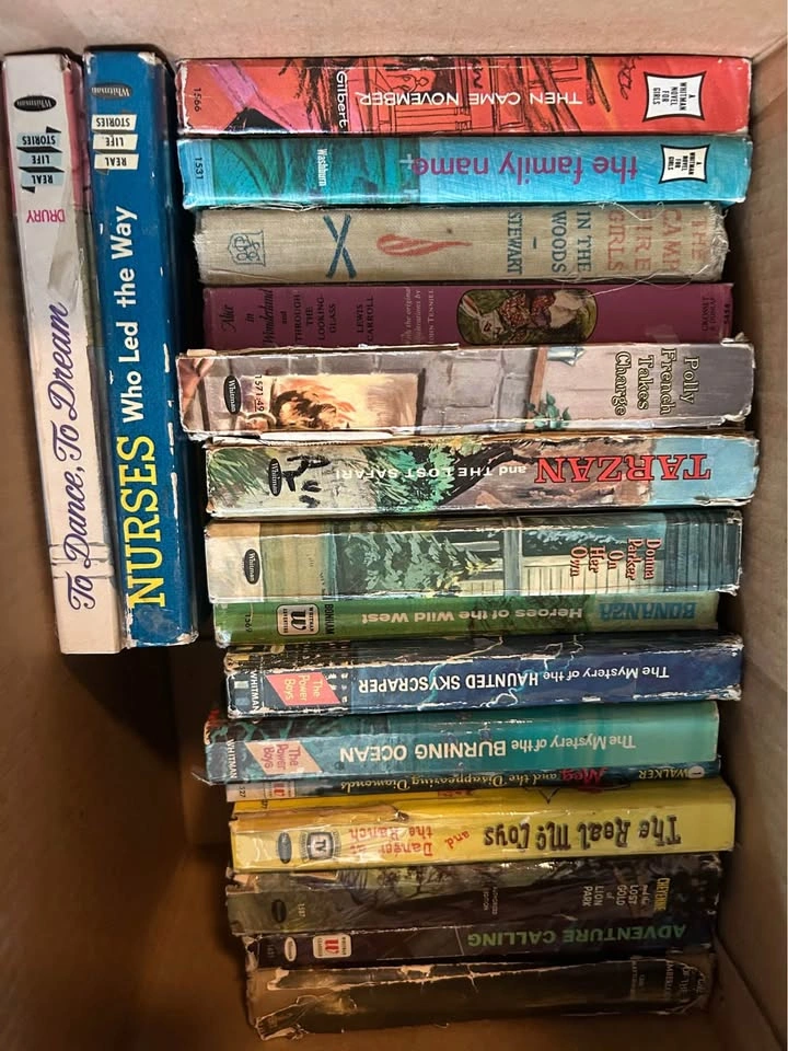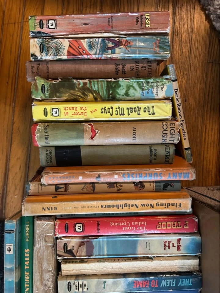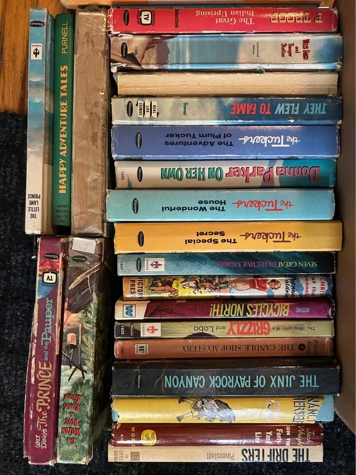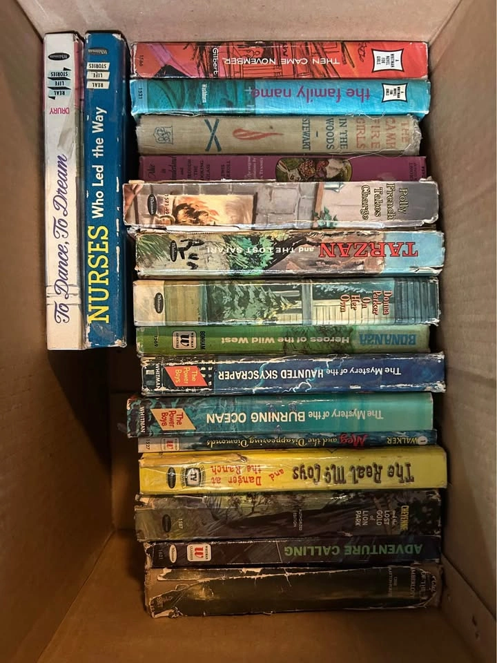 Two boxes of vintage hardcover books – many Whitman Authorized Editions, Grosset & Dunlap, and mid-century children’s/YA novels. Lots of collectible titles with dust jackets (see photos for exact books and condition). Includes series & titles like: • Whitman Authorized TV & Adventure Editions (Tarzan, Bonanza, Donna Parker, Polly French, The Tuckers, Nancy Drew-style mysteries, Robin Kane, The Power Boys, etc.) • Classics & Literature (Little Prince, Eight Cousins by Louisa May Alcott, Through the Looking Glass by Lewis Carroll, Prince and the Pauper by Mark Twain, etc.) • Animal & Adventure Stories (Lassie, The Real McCoys, The Biography of a Grizzly, Wolves & Wild West themes, etc.) • Vintage Girls’ & Boys’ Series (Donna Parker, The Tuckers, Robin Kane, Polly French, Camp Fire Girls, etc.) • Miscellaneous hardcovers from Grosset & Dunlap, Saalfield, Triangle Books, Little Brown, and more. 📦 Condition: Mixed. Some well-read, some with dust jackets in decent shape, others with wear. Sold as seen in the photos. Check pictures for exact titles and condition before messaging. 💡 Perfect for: ✔️ Collectors of Whitman / Grosset & Dunlap ✔️ Vintage décor / retro shelf display ✔️ Book resellers (many sell individually online) ✔️ Nostalgia readers 👉 Only the whole lot. No cherry picking individual books. 📍 Pickup in Saskatoon (310 25th Street West). ⚠️ Disclaimer: Titles and conditions are as shown in the photos. Some with jackets, some without. Sold as a lot, as is.