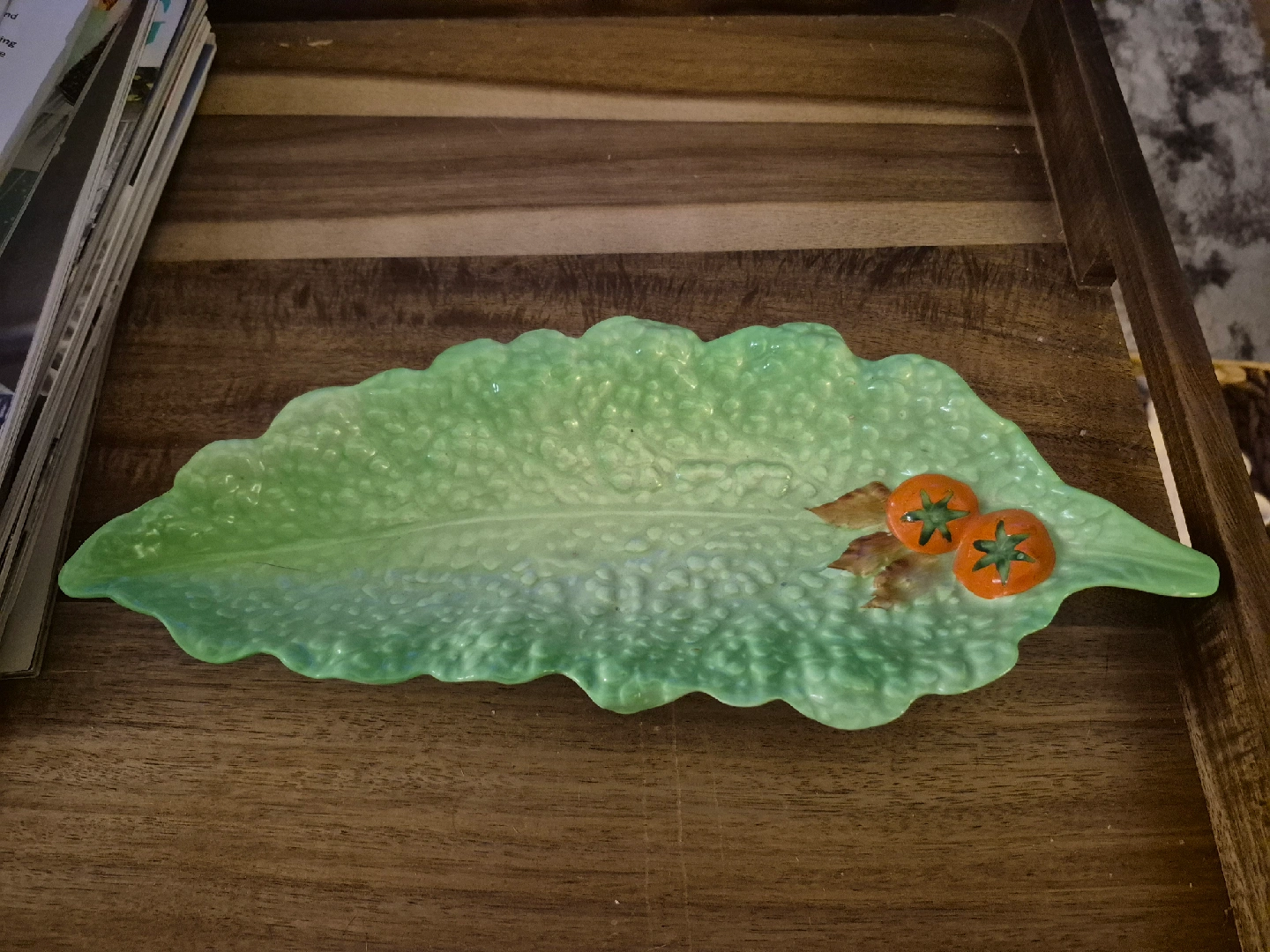 Selling a vintage Bordallo Pinheiro lettuce leaf dish! It's a unique piece with lovely detailing, perfect for adding a touch of whimsy to your table setting. The dish features two small tomatoes as well