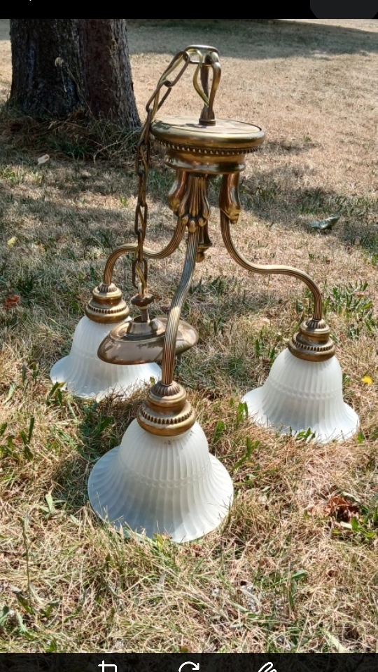 Selling a vintage brass chandelier with three lights. The shades are a frosted white colour. It's in good condition. Pickup in Lindsay.