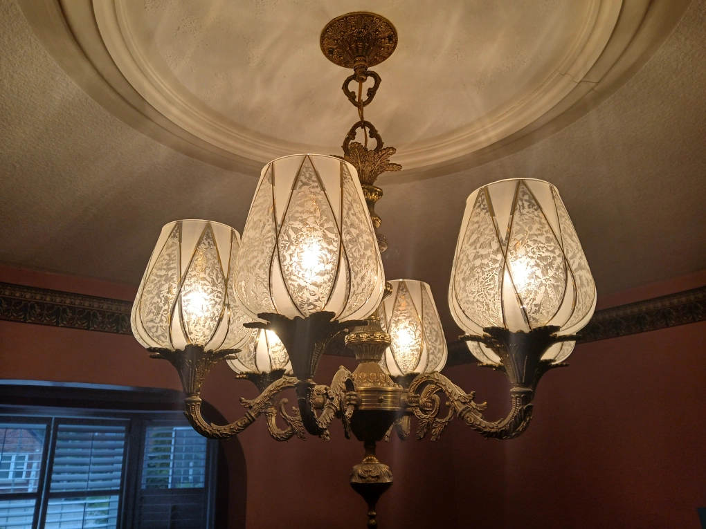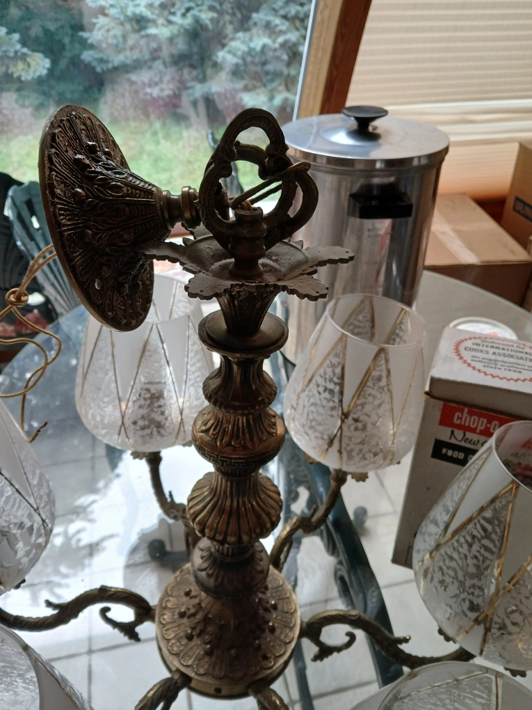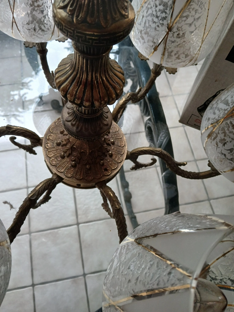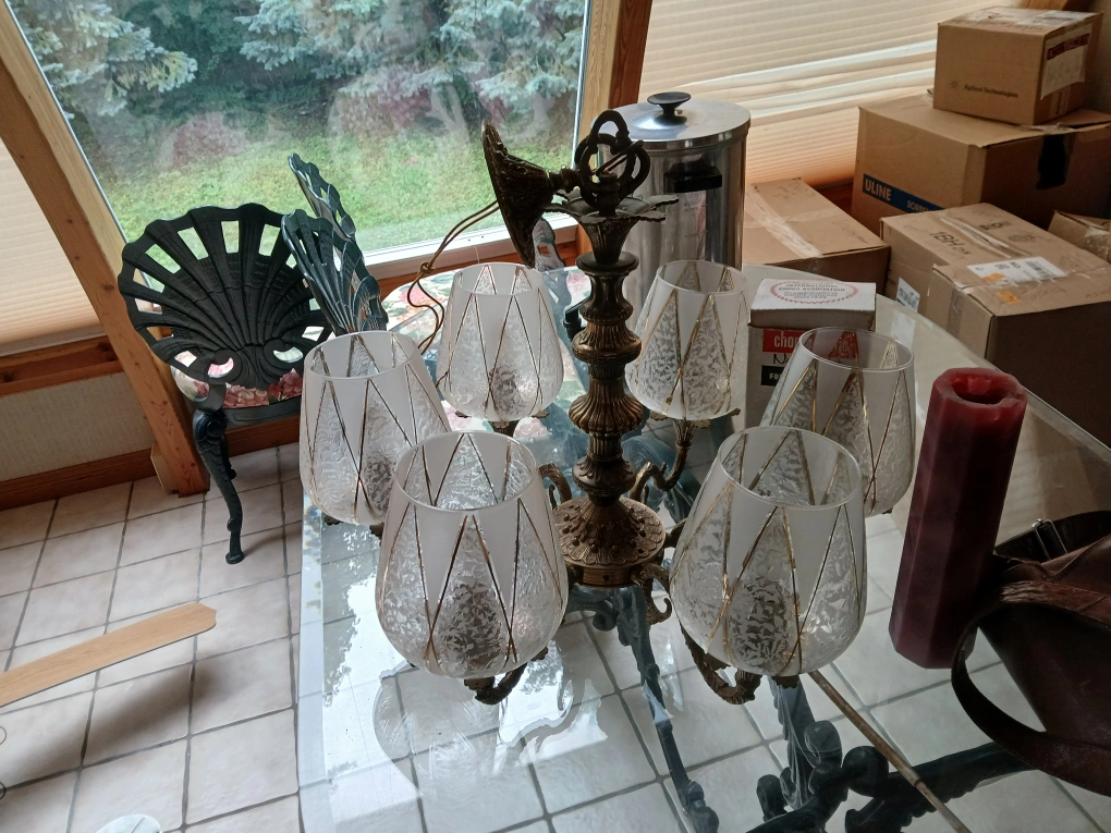 Selling a beautiful vintage chandelier! It features a brass frame and six lovely glass shades. It would be a great addition to any dining room or living room. Please message me if you are interested!