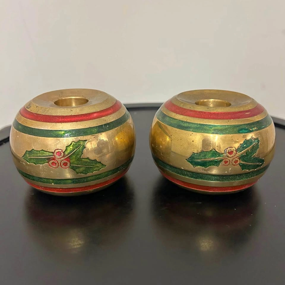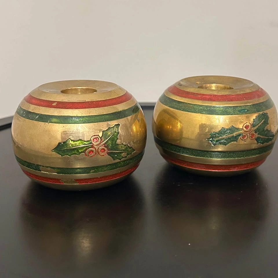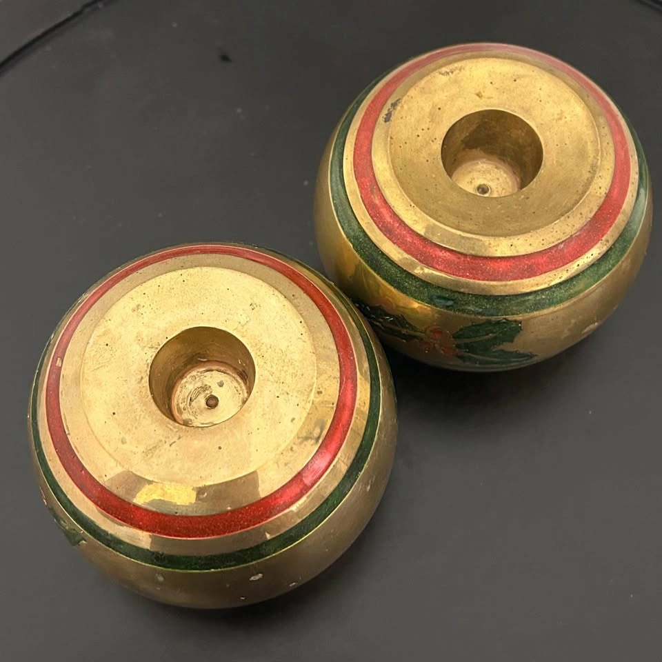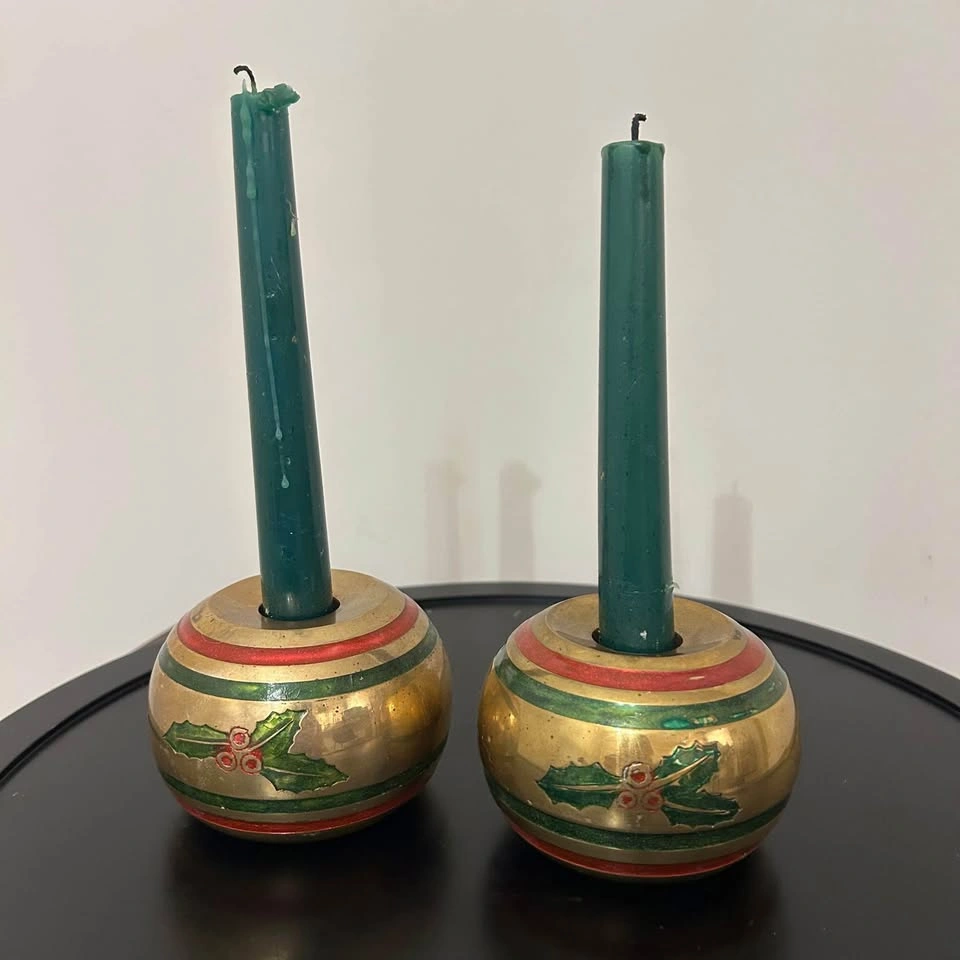 Vintage Brass Christmas Candle Holders – Hand Painted (Pair)