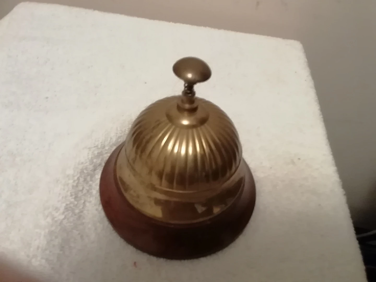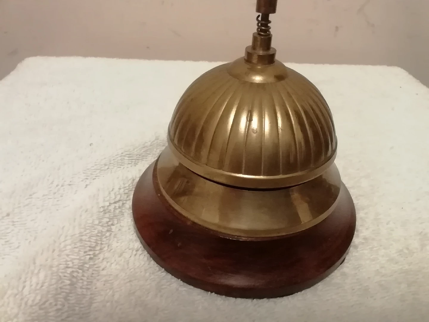Here's a lovely vintage brass reception bell. It's perfect for adding a touch of old-world charm to your home or business. It has a beautiful brass finish on top and a dark wood base. It's in great shape and ready to be used!
