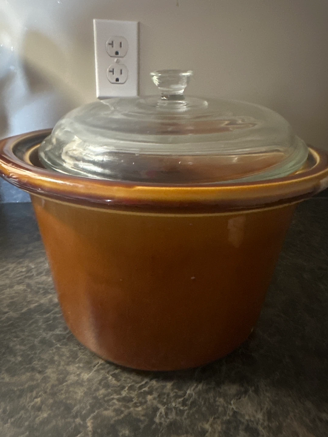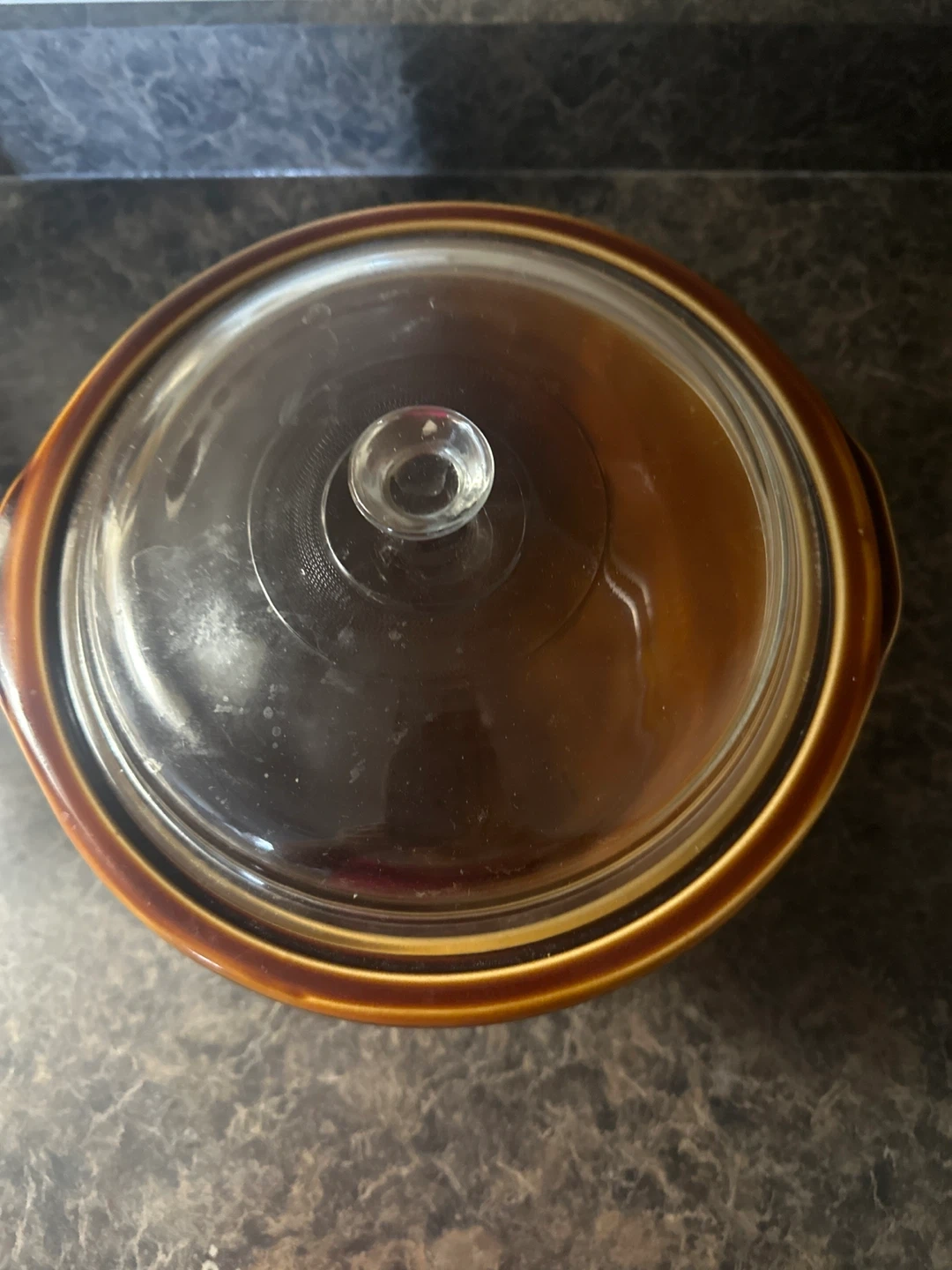 Selling a vintage brown ceramic casserole dish with a glass lid. It's in great shape and ready for your next potluck or family dinner! The colour is a warm, earthy brown, perfect for any kitchen.