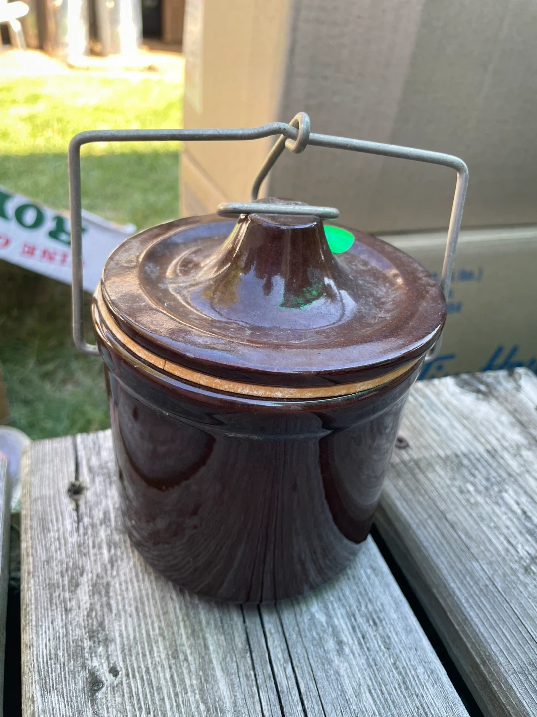Selling a vintage brown ceramic pot with a wire bail handle.