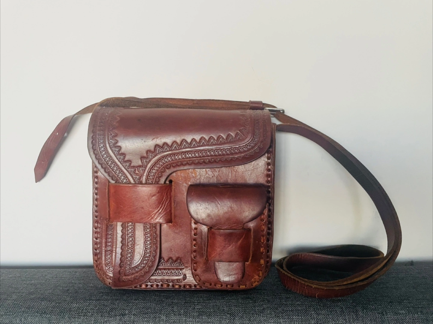 Handcrafted leather crossbody bag from South America with a unique design. Features intricate tooled detailing and a small front pocket. Adjustable shoulder strap which shows a bit of wear but still in great condition.