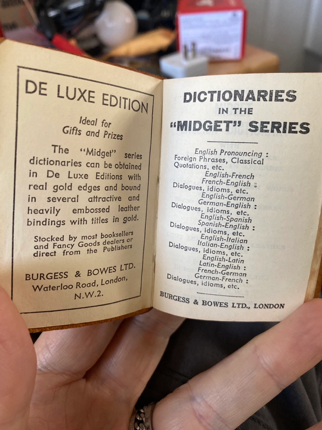 Leather-bound dictionary. Gold edges. Several attractive and heavily embossed leather bindings. Titles in gold. Ideal for gifts and prizes. We’re in Waasis but go into Freddy often.