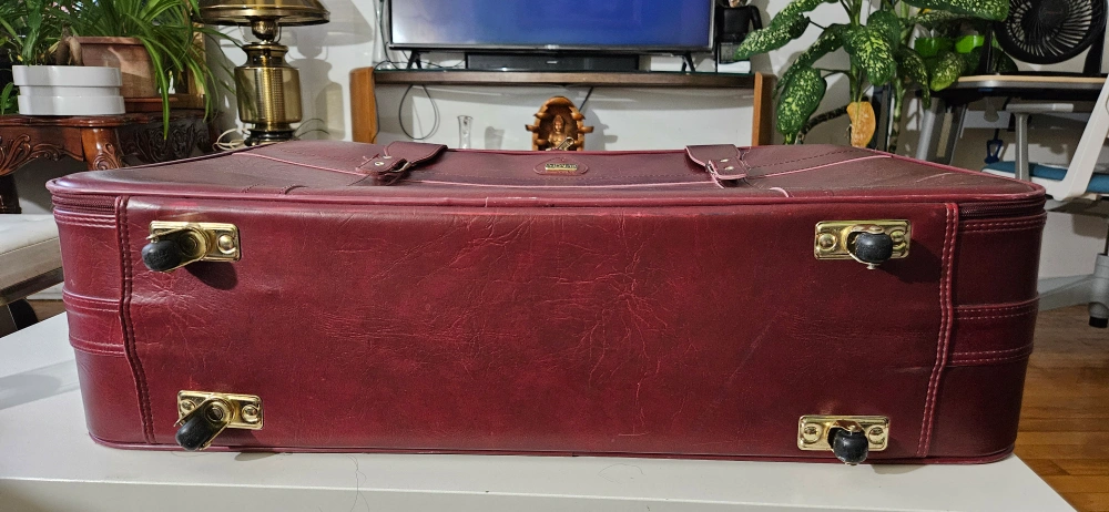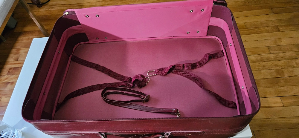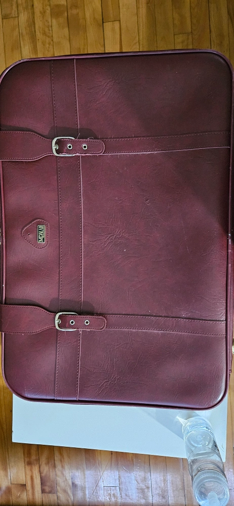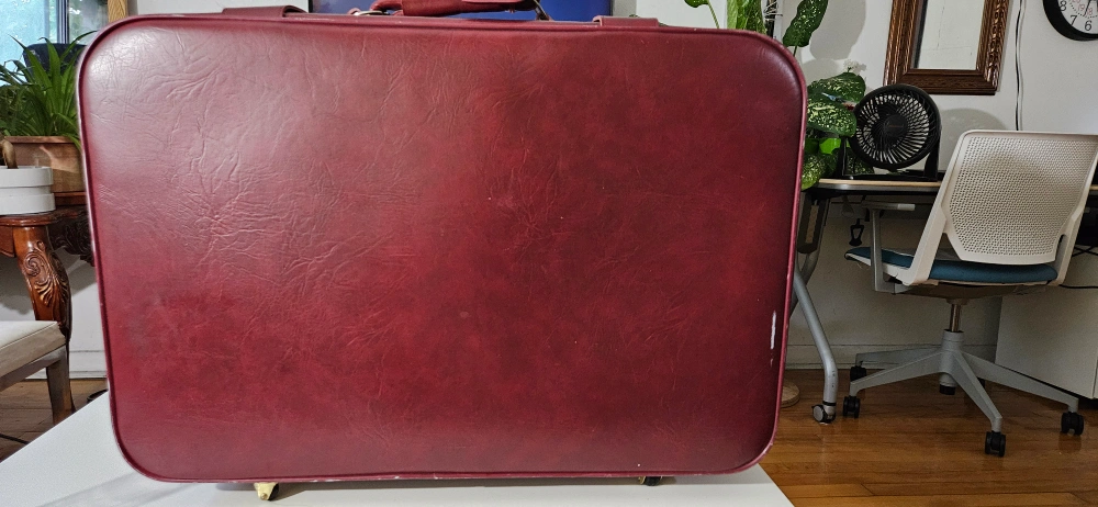 Selling a vintage burgundy leather suitcase. It has a unique, classic look with a soft pink interior. Perfect for travel or as a decorative piece!