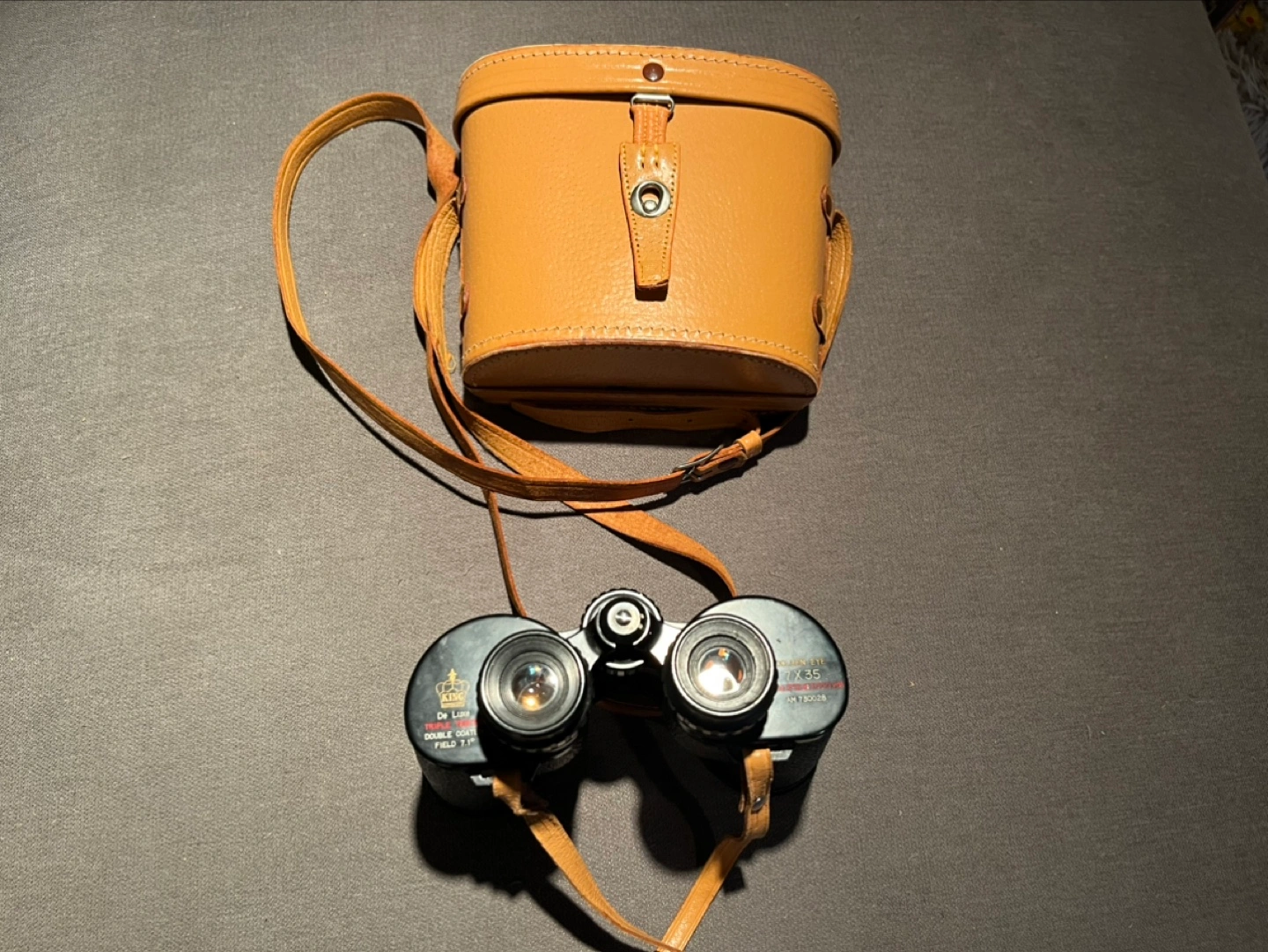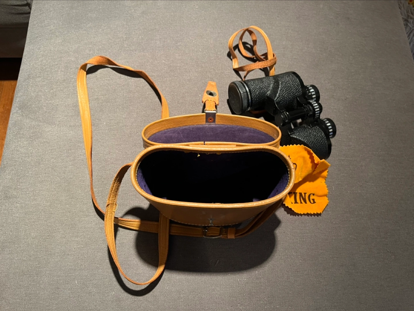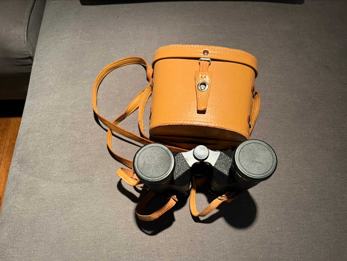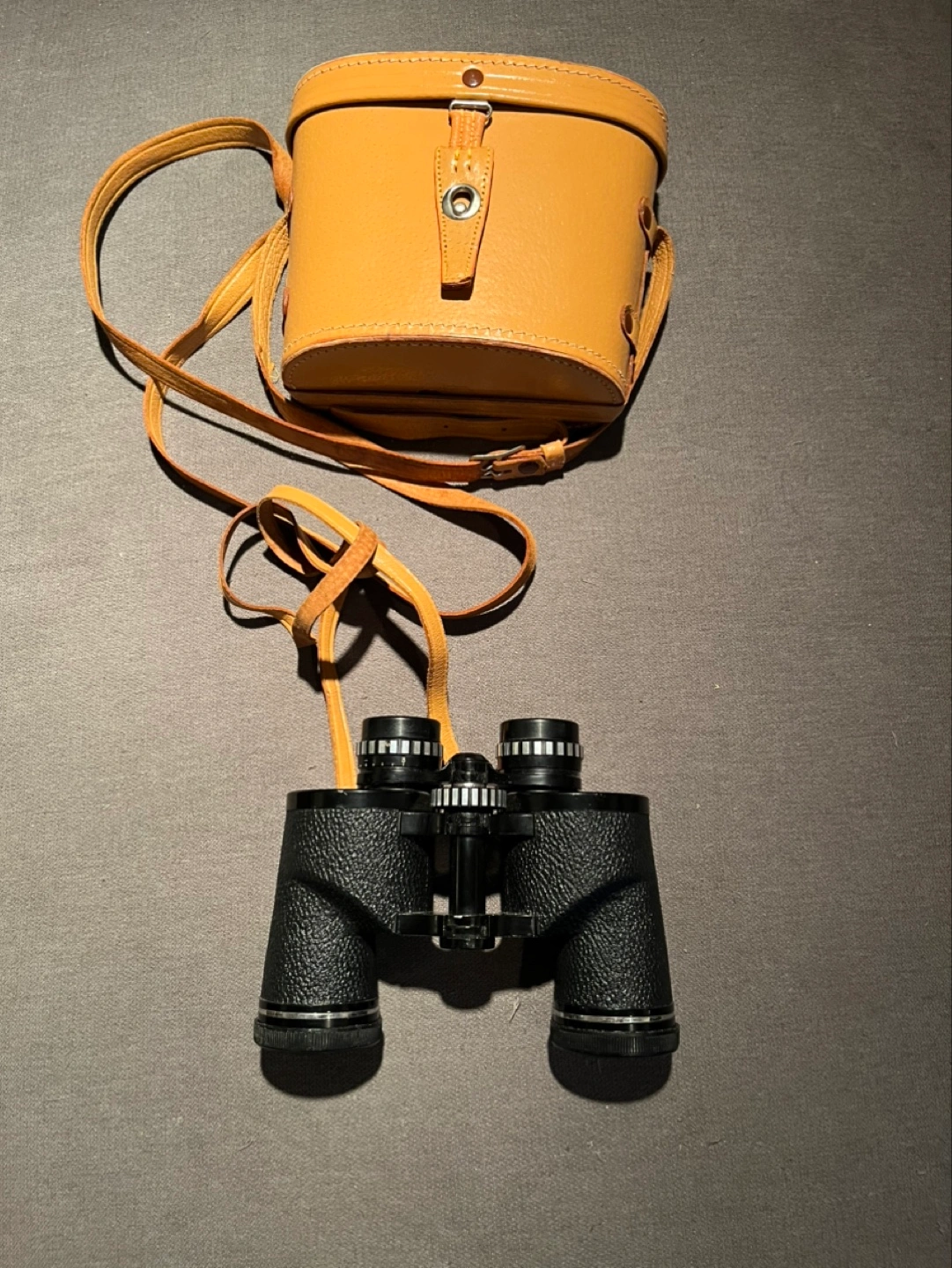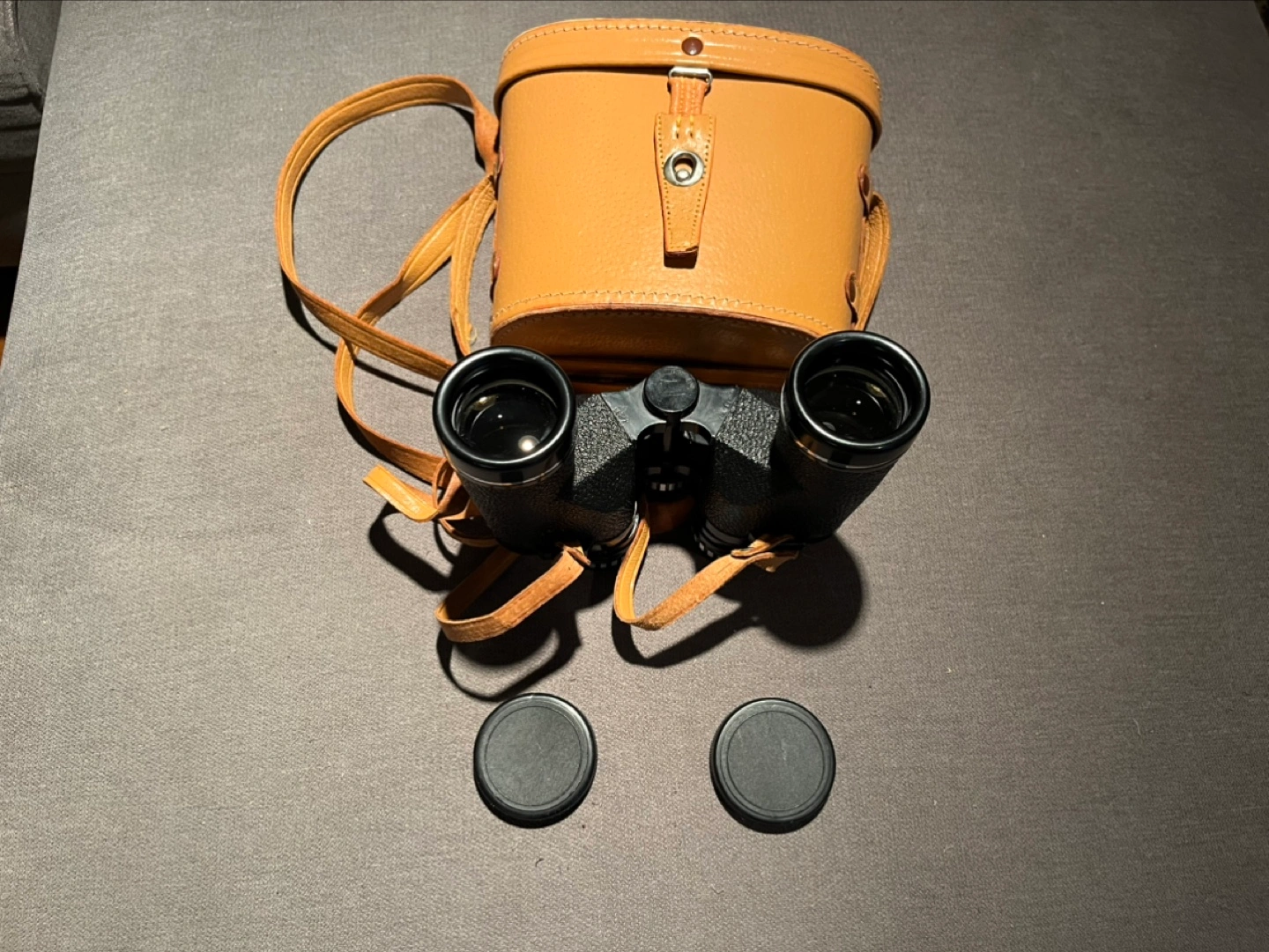 Vintage Bushnell binoculars with leather case and strap. Includes lens caps.