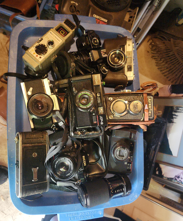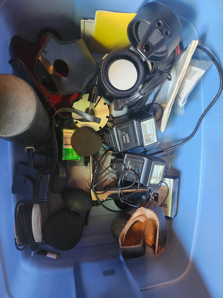 Selling a collection of vintage camera equipment and accessories. The lot includes various cameras and flashes. Great for collectors or enthusiasts!