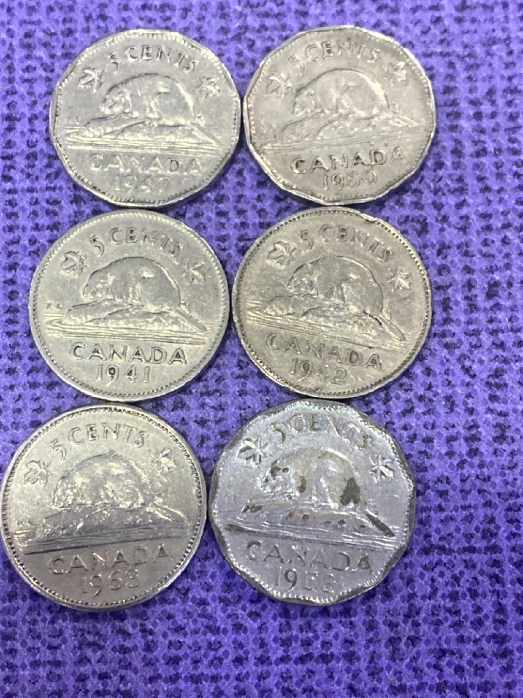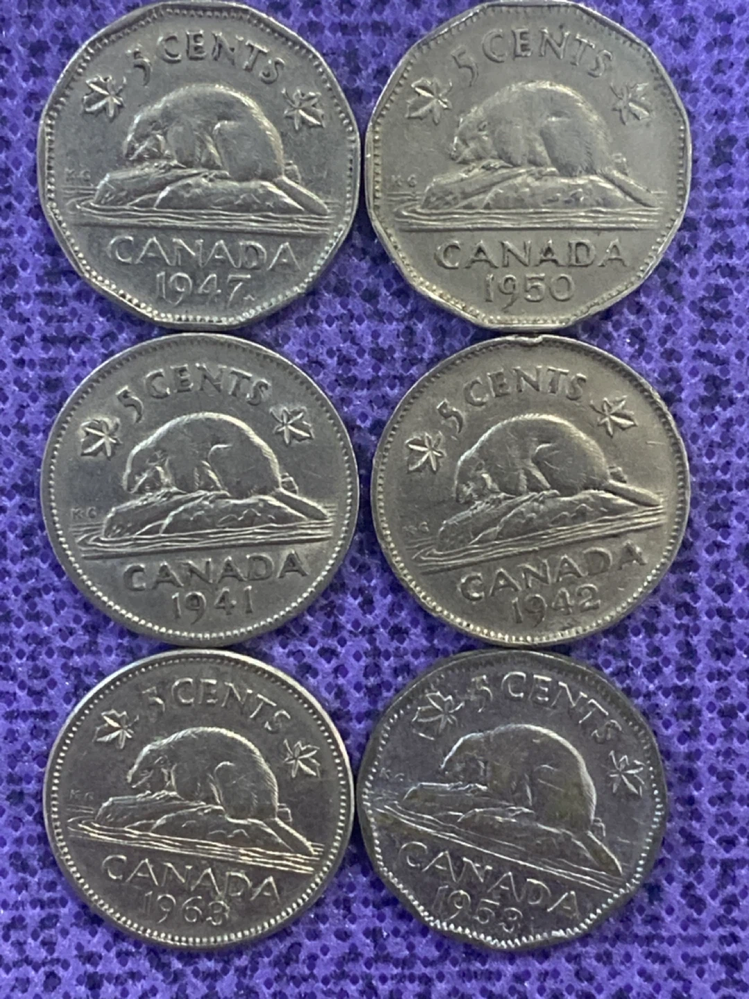 Selling a collection of vintage Canadian 5 cent coins. These coins feature the beaver design and are from the 1940s, 1950s, and 1960s. Great for collectors or anyone interested in Canadian history!