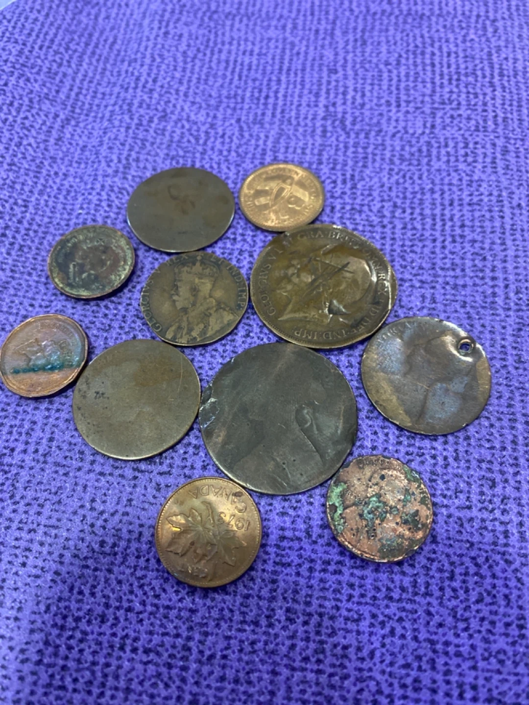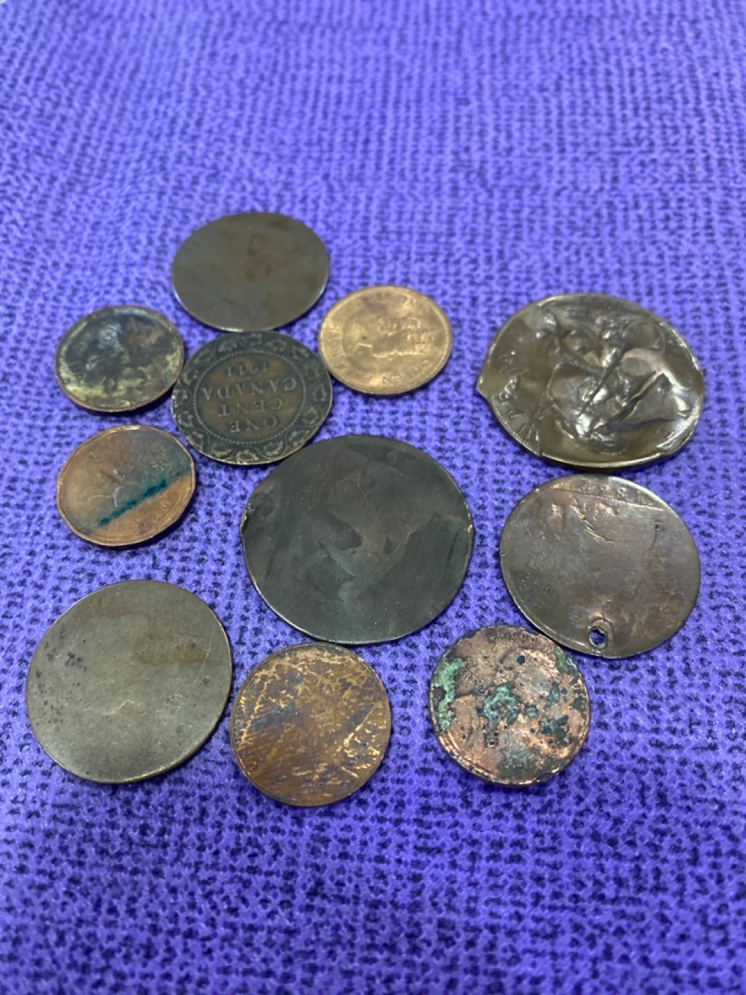 A collection of vintage Canadian and British coins. They show signs of wear and age, adding to their charm. Perfect for collectors or those interested in history!