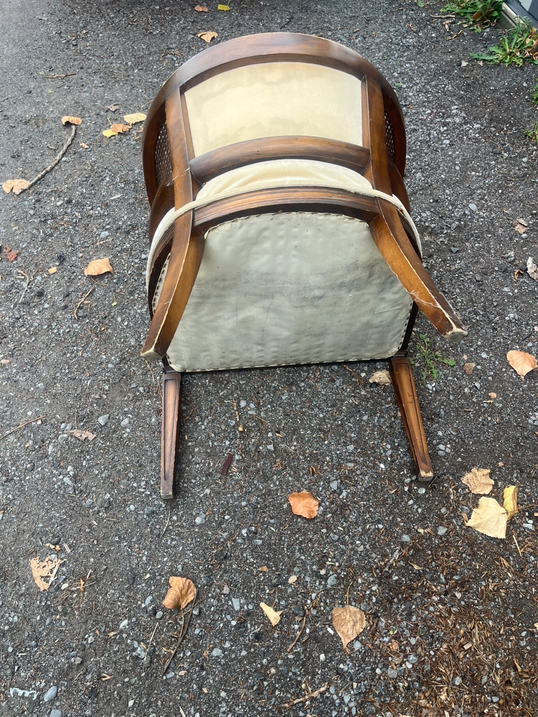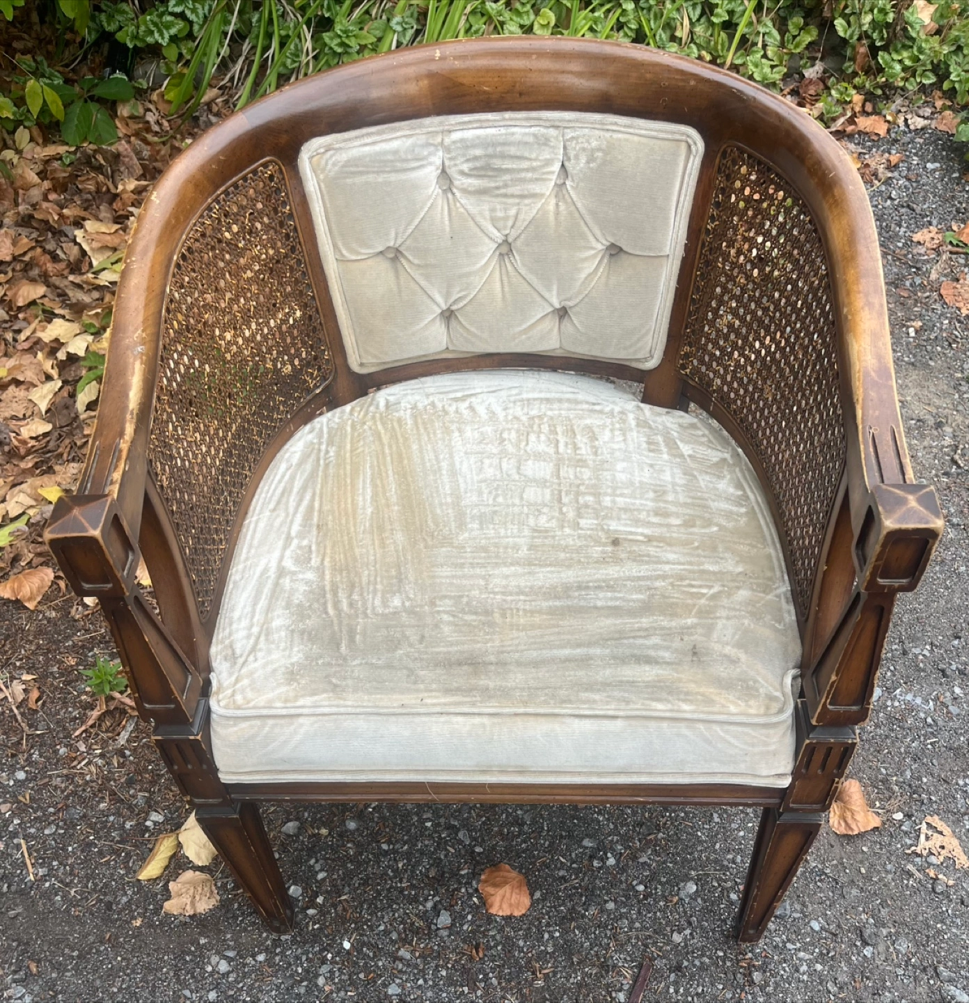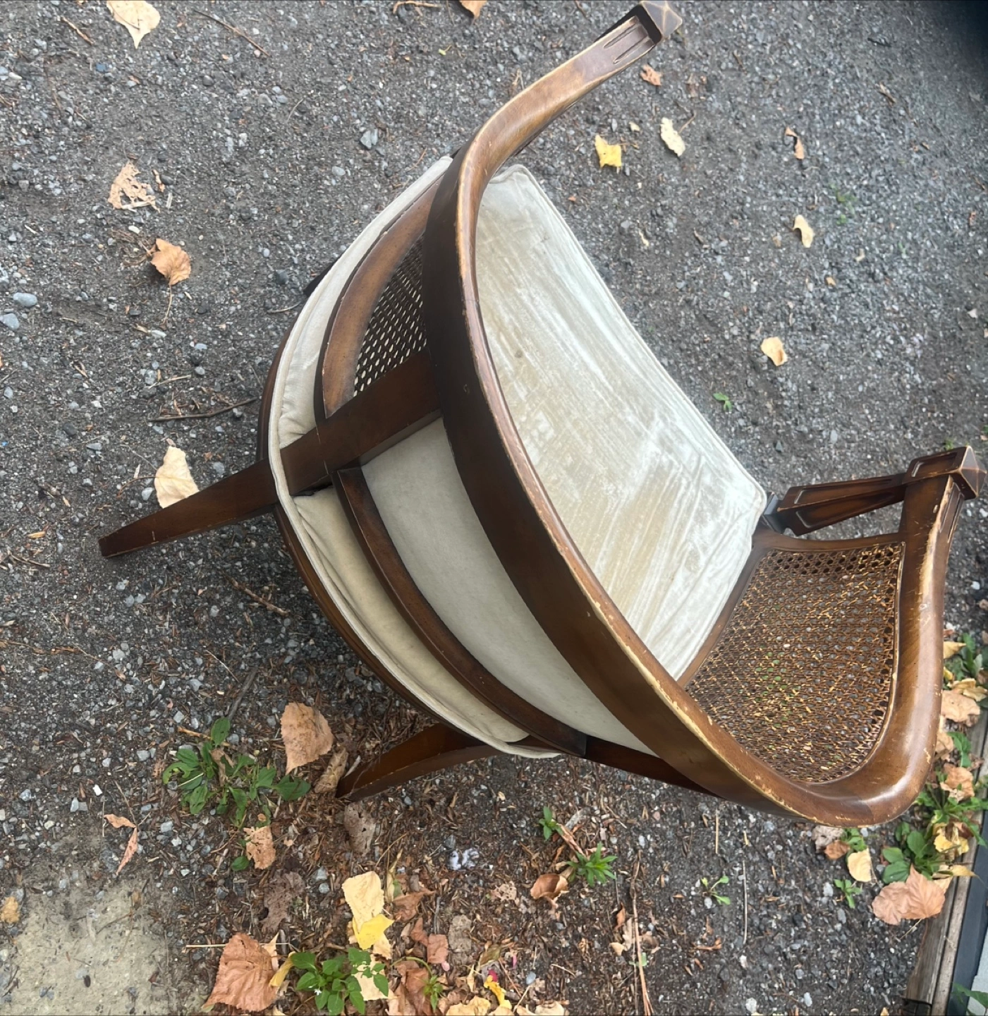 Selling a vintage cane back accent chair. It has a unique design with a wooden frame and woven cane back. The seat cushion is a light colour and tufted. It would be a great addition to any living room or bedroom!