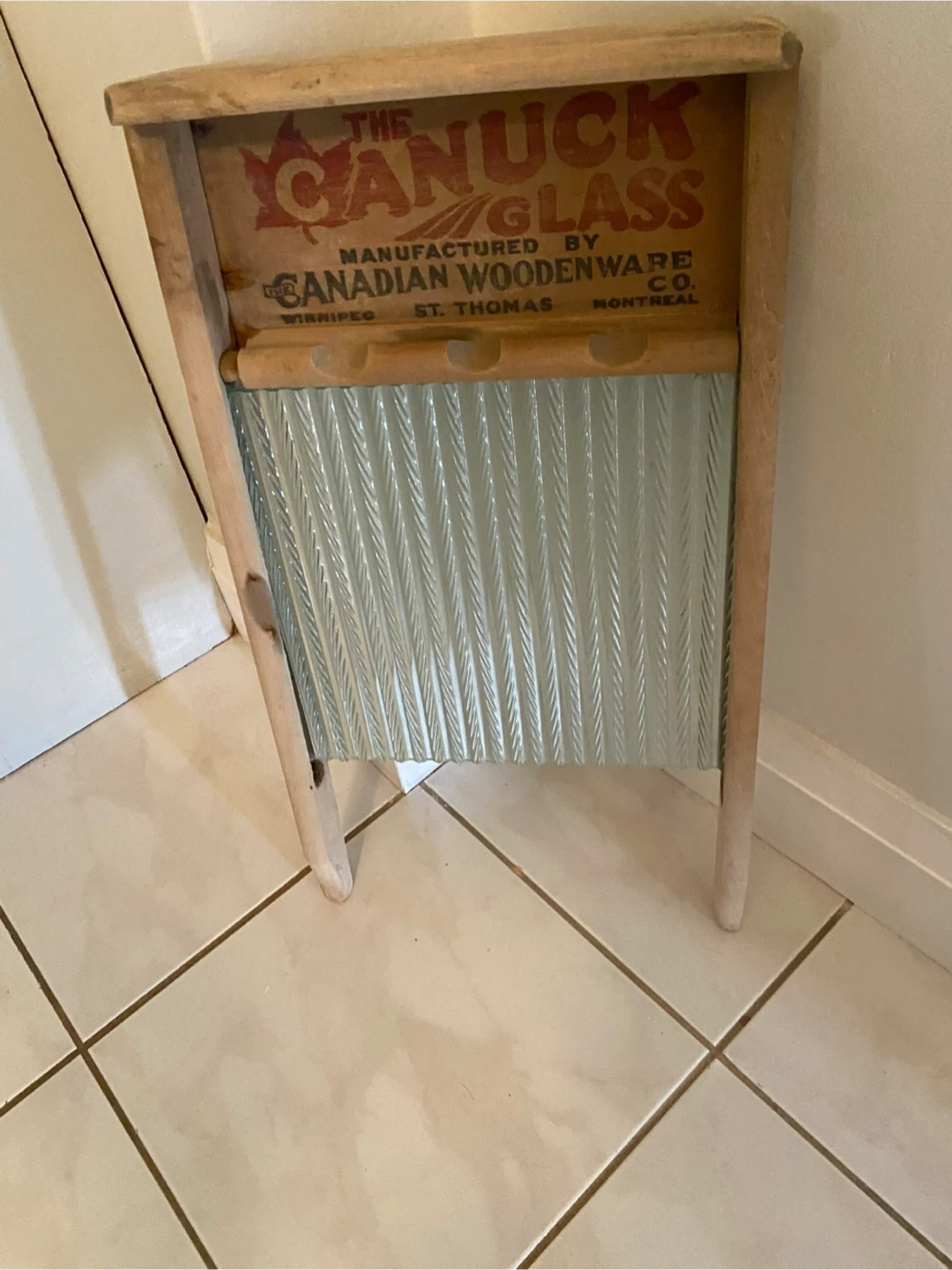 Selling a vintage Canuck Glass washboard manufactured by Canadian Woodenware Co. It has a wooden frame and a glass washboard surface. A unique piece of Canadian history!