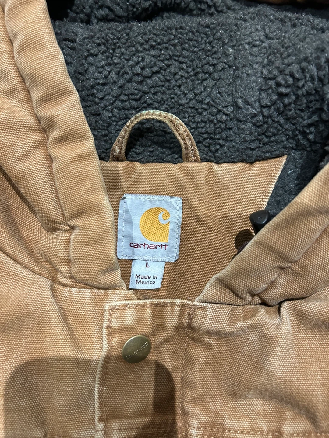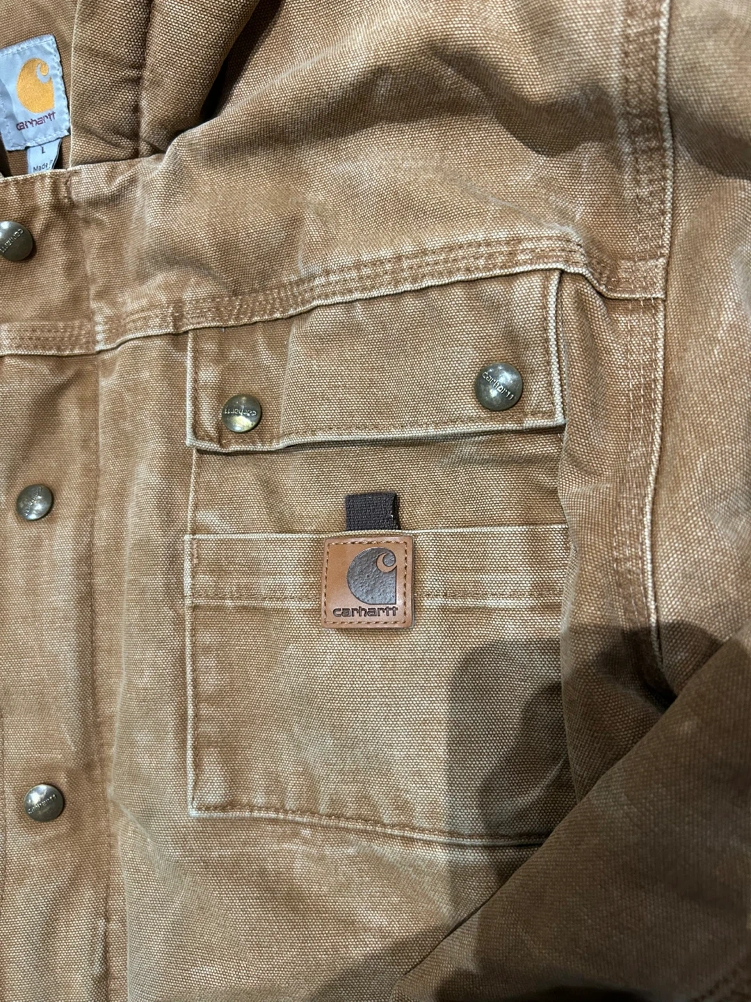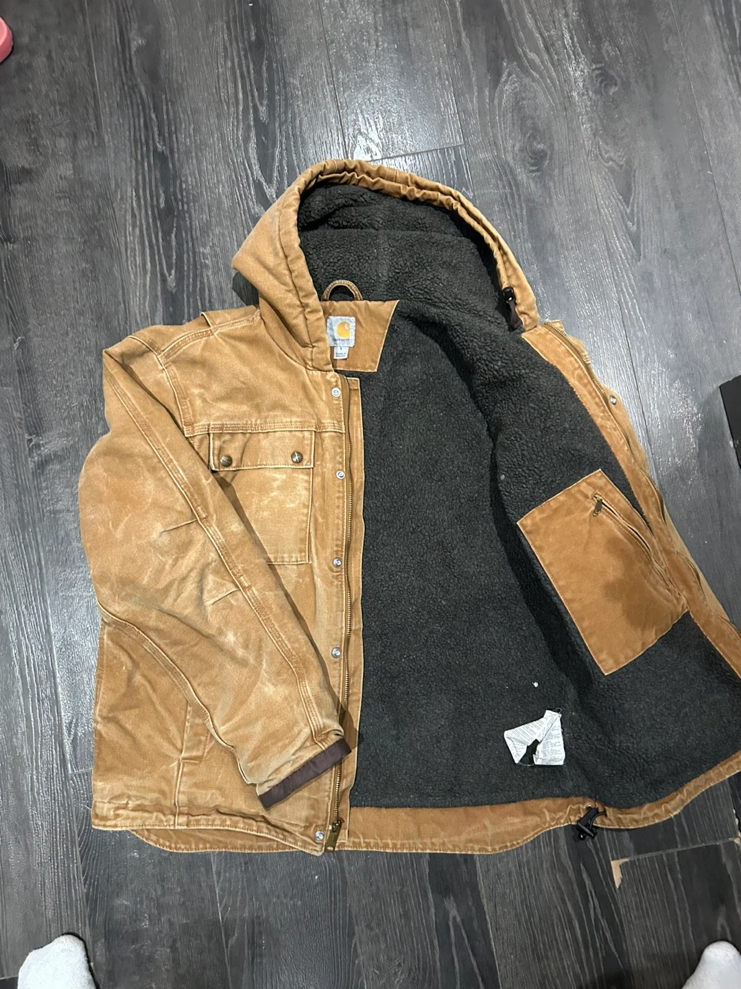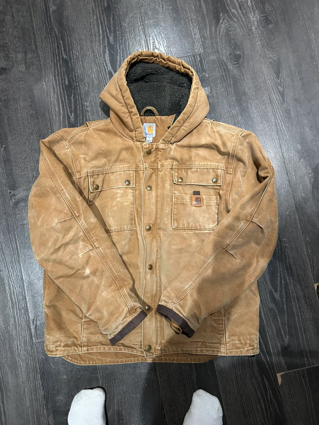 Rugged. Warm. Built to Last. Tackle the cold with confidence in the Carhartt 102285 Bartlett Jacket, a heavyweight work jacket engineered for durability, warmth, and comfort. Constructed with tough 12-ounce, 100% ringspun cotton duck and reinforced triple-stitched seams, this sherpa-lined jacket is designed to handle the harshest conditions — whether you're on the jobsite or off the grid. Key Features: Heavyweight Cotton Duck Fabric Crafted from premium 12 oz. ringspun cotton duck for long-lasting durability and abrasion resistance. Warm Sherpa Lining Soft sherpa lining in the body offers exceptional warmth, while quilted nylon-lined sleeves ensure easy on/off without sacrificing insulation. Rugged, Weather-Ready Design Full-length front zipper with outer and inner storm flaps keeps wind and cold at bay. Adjustable hood and internal rib-knit storm cuffs help lock in heat. Comfort & Mobility Features a bi-swing back and pleated elbows for better range of motion — so you stay mobile while you stay warm. Plenty of Storage Equipped with multiple pockets, including two snap-button chest pockets, two lower front handwarmer pockets, and interior pockets for secure storage. Tailored Fit & Drop-Tail Hem Designed with a slightly contoured fit and extended rear hem for added coverage and a clean, rugged style that transitions from workwear to everyday wear. Specs: Shell: 12 oz. 100% ringspun cotton duck Body Lining: Sherpa fleece Sleeve Lining: Quilted nylon Hood: Attached, adjustable with drawcord Closures: Full zip front with storm flaps and snap buttons Fit: Regular Color Options: Varies by availability (e.g., Carhartt Brown, Dark Brown, Black) Model #: 102285 (Discontinued) Note: This model is discontinued by Carhartt and highly sought after by fans for its superior build and authentic workwear appeal. Limited sizes and colors available — once it’s gone, it’s gone.