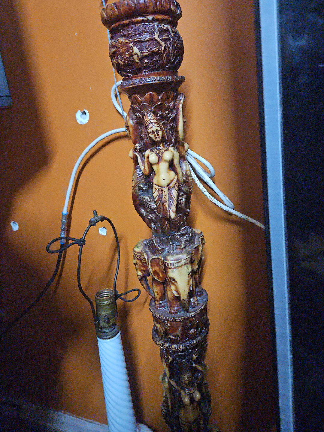 Selling a unique, vintage lamp base featuring intricate carvings of figures and elephants. It's a statement piece that would add character to any room. The base has a white, textured column and a standard bulb socket. Perfect for adding a touch of exotic charm to your home!