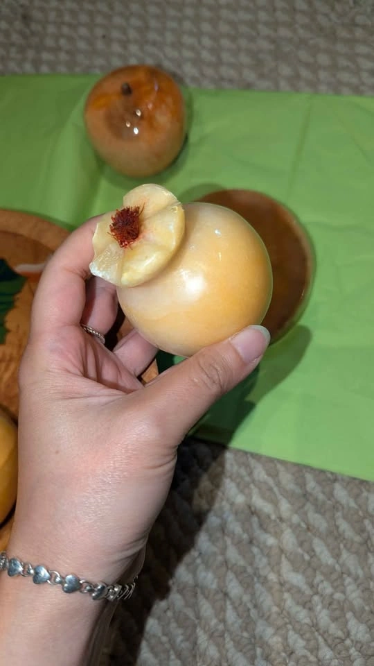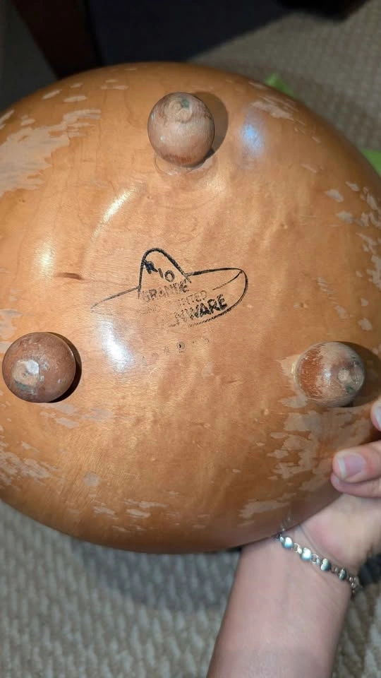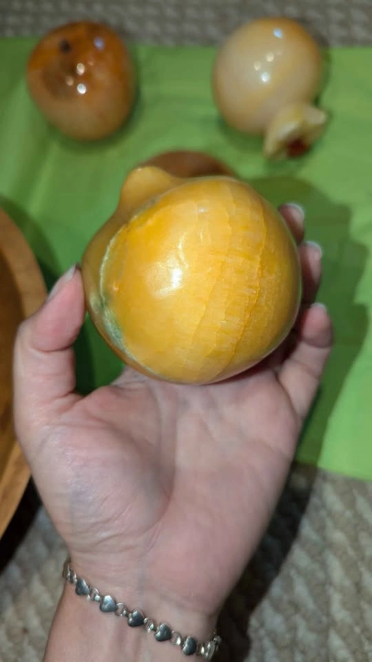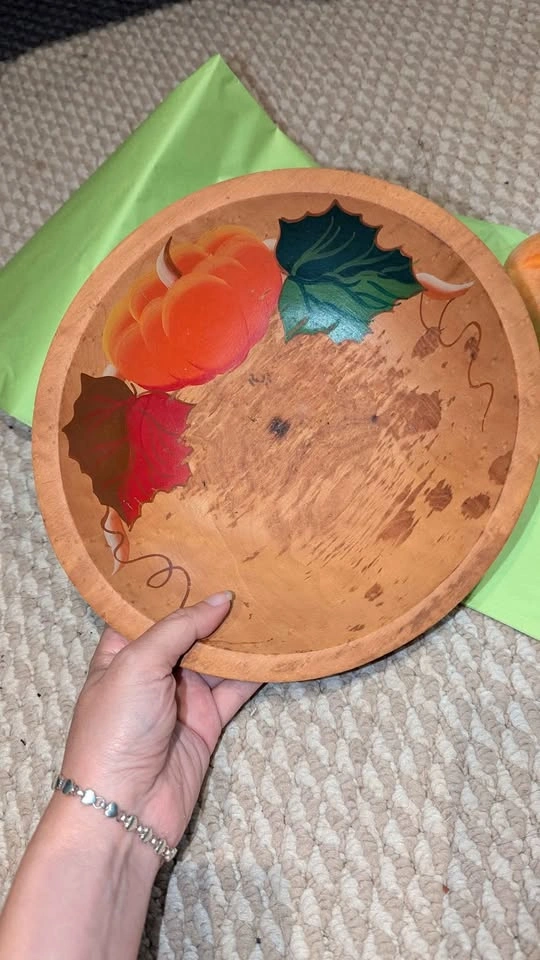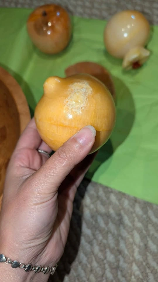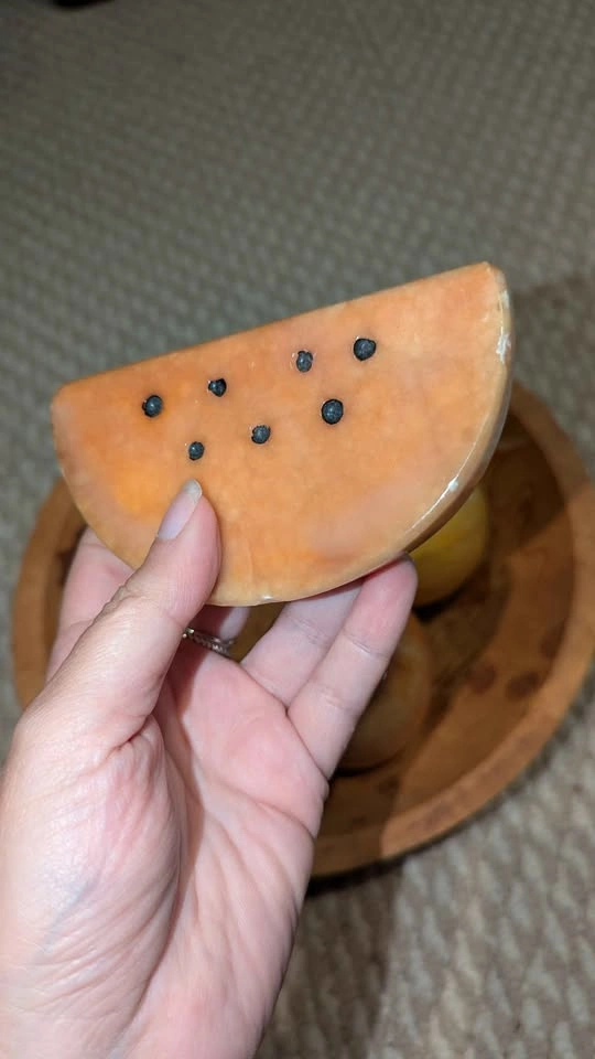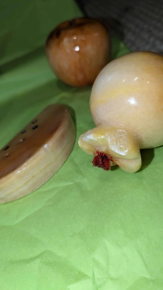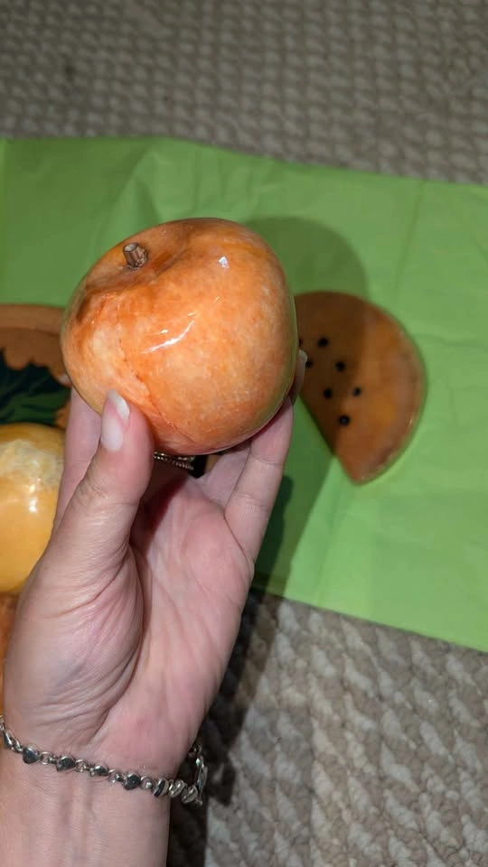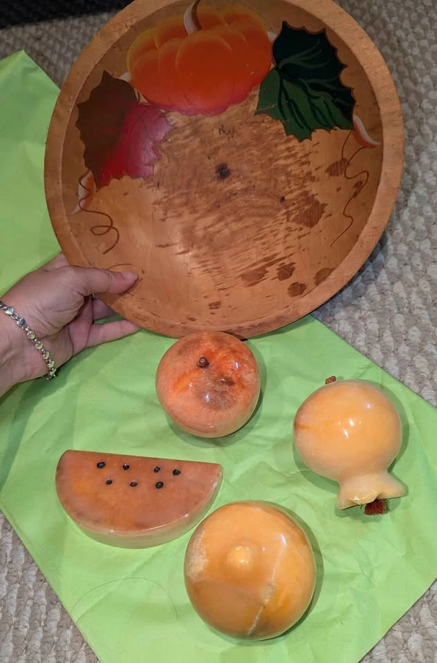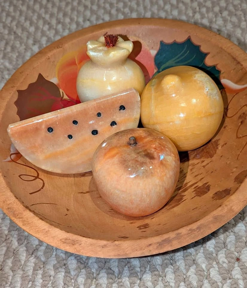 Collectable Vintage stone fruit set In overall good vintage condition with some chipping on edges ★Watermelon with inlaid seed (minor edge chipping) ★Apple with stem (perfect) ★Orange/Lemon (some stone discoloration) ★Persimmon with stem on both ends (some small chipping at edges - shown in pics) ★Wooden bowl (3 pedestal base, hand printed Rio Grande, fall pumpkin design, vintage wear ) 25 firm for all items together. Not selling individually.