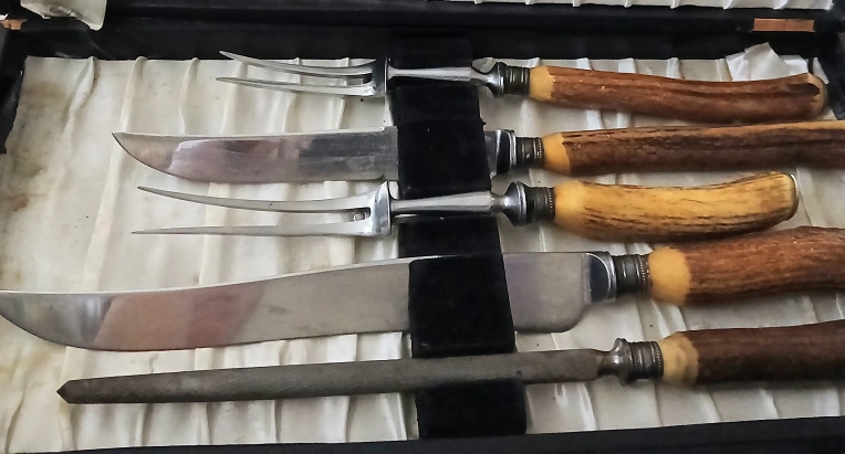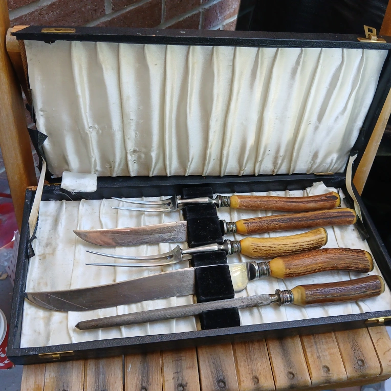 Selling a vintage carving knife set. It includes knives, forks, and a sharpening steel, all neatly arranged in a box. The handles appear to be made of antler, giving it a unique and rustic look