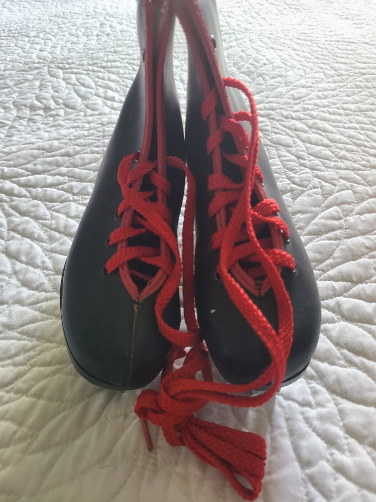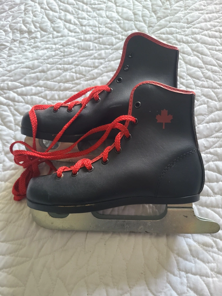 Selling a pair of CCM Tacks ice skates in size 6. They feature a black and red design with the Canadian maple leaf. decoration only as the blades are bent. Meant to be hung on a wall or convo piece.