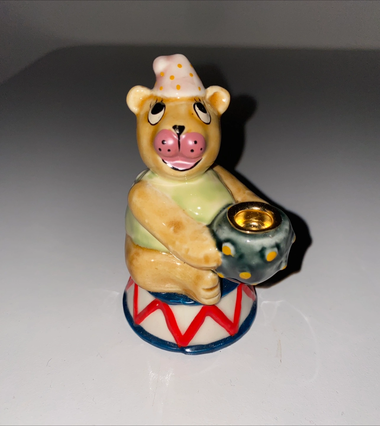 Selling a cute vintage ceramic bear candle holder! It's in great condition and would be a lovely addition to any room. The bear is sitting on a drum and holding a candle holder. Perfect for adding a touch of whimsy to your home decor