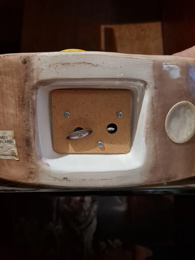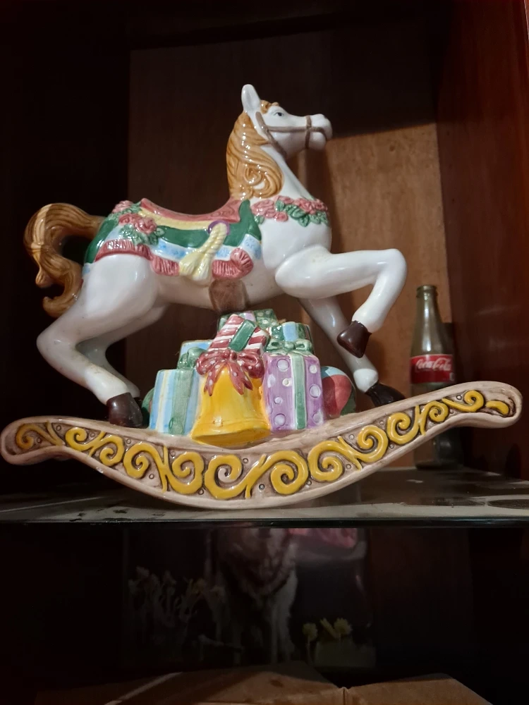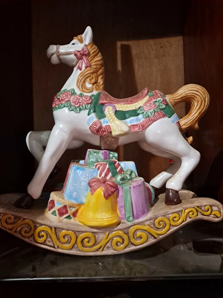 This is a vintage ceramic rocking horse music box. It's a charming piece with a horse adorned with festive decorations, sitting atop a rocking base loaded with gifts and a bell. It plays music when wound up, adding a touch of nostalgia to any space