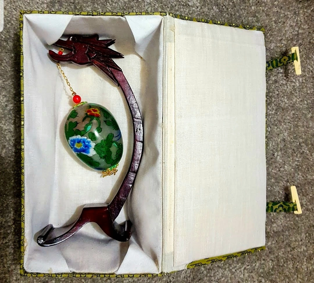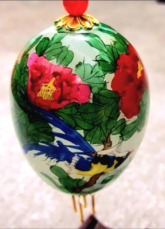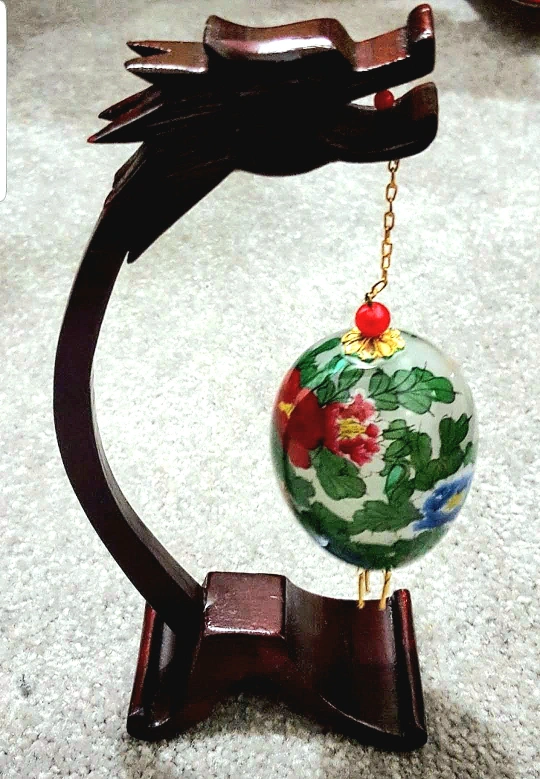 Beautiful vintage hand painted Chinese egg art piece, with Chinese Dragon display stand in original box. The egg is decorated with intricate floral and bird designs. A unique decorative item to add a touch of elegance to your home.