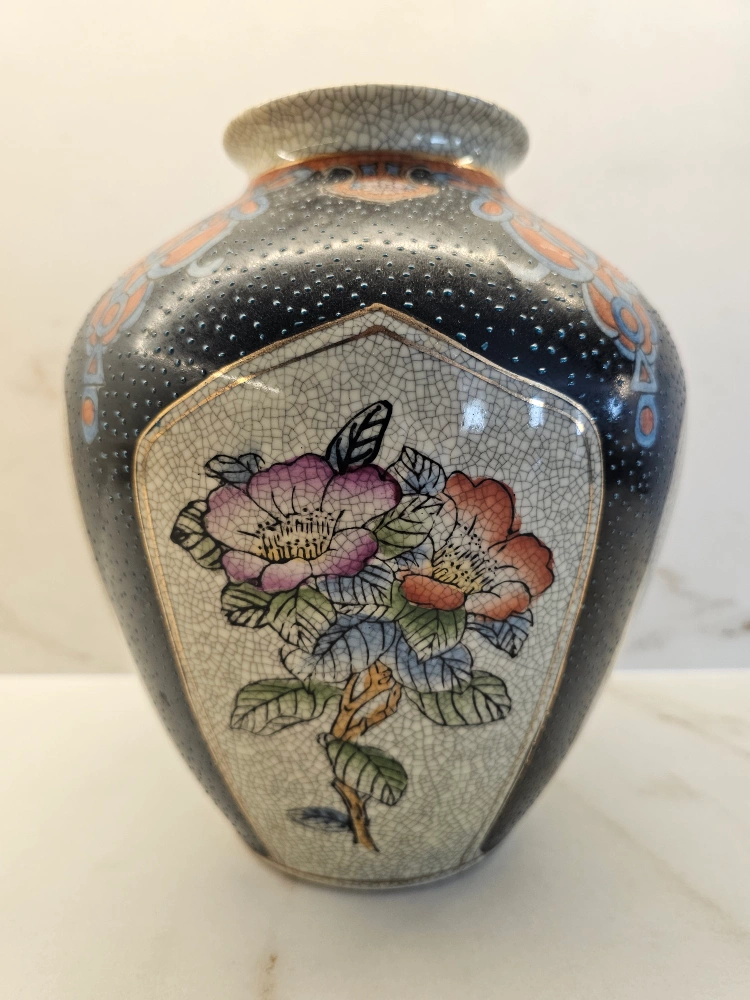 Here's a lovely ceramic vase with a unique floral design! It's perfect for adding a touch of elegance to any room. The vase has a crackled glaze effect. It would look great with fresh flowers or as a standalone decorative piece. 8.5 inches tall.